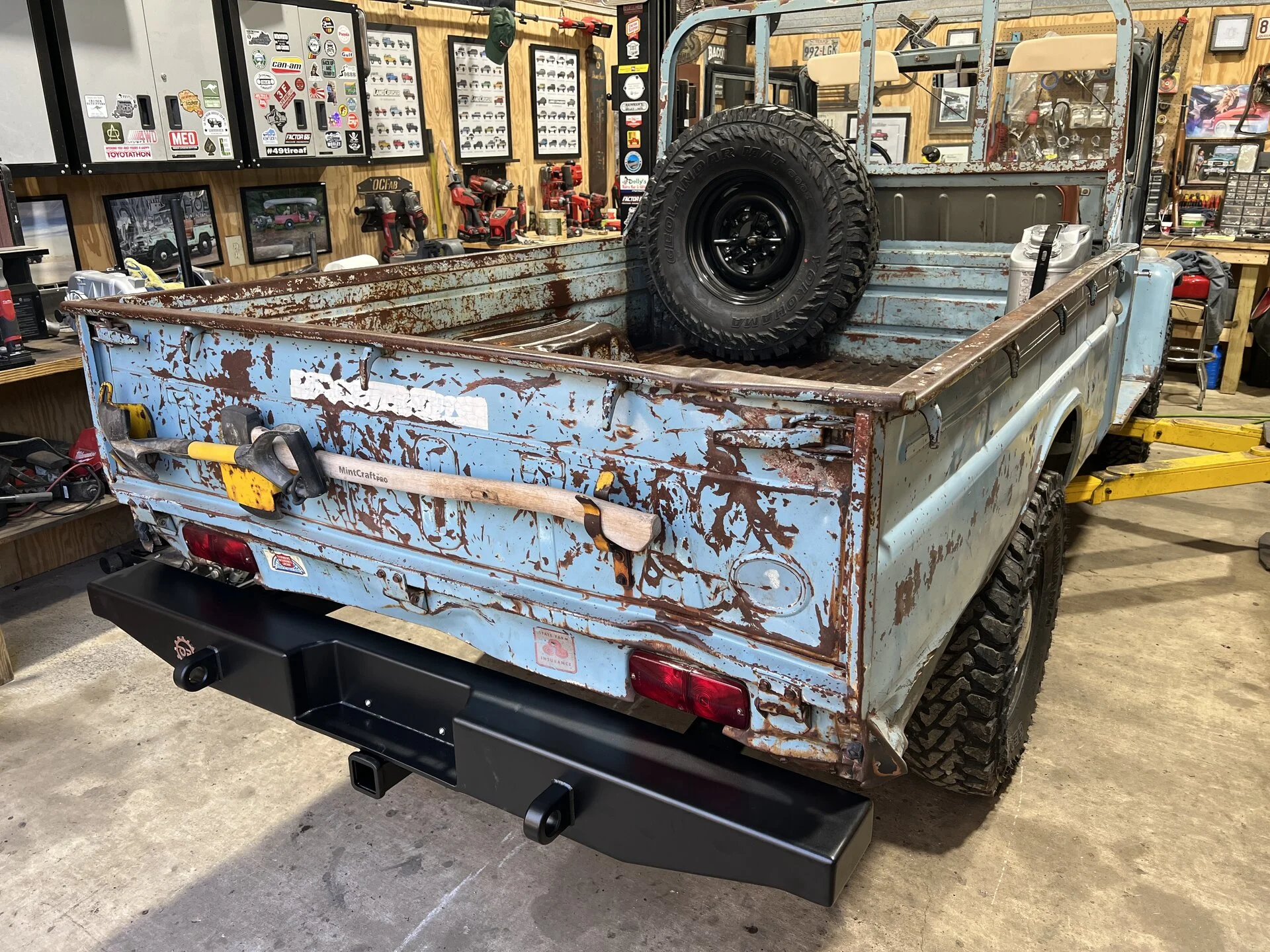 Maybe take some chains or a wire wheel to it… so shiny compared to the beautiful patina… it is beautiful in its own way of course!My shop model came out to admire the large nuts on this bumper and help me lift the heavy mofo on the lift table.