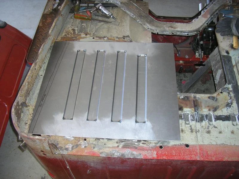 Anyway... this week at work, in my spare time ;), I drew up, punched out and bent up a panel that mimics the drivers side floor. It's got the same three long and one short rib.