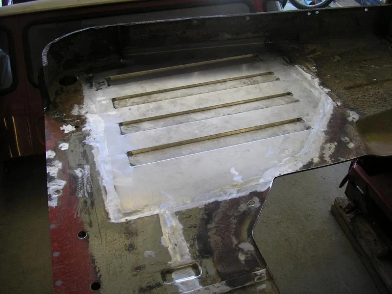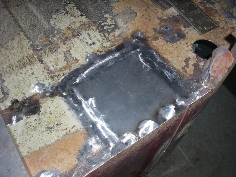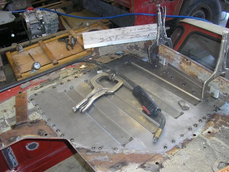 Positioned carefully and tacked in place. I find it easiest with some copper bar or aluminum clamped under the weld area to absorb the heat and keep the seam flush. Also, I'm finding it best no to have the patch panel too tight of a fit. If you force a tight patch in you will have too much material and it will oilcan on you. Better to have a small gap and let the weld pull the panel and floor tight as it cools. Work slow so you only do it once.