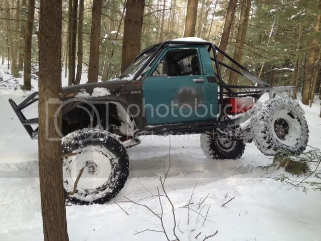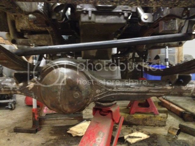 I got my front axle mocked up. I had to notch the housing to make clearance for the passenger Ruff Stuff perch. I still need to finish modifying the passenger perch, cut and turn the knuckles, truss it, armor it and such before its done. I'm also going to have to modify the truck oil pan a bunch, that pinion is going to be really close to it. I think I'm going to take a couple inches out of the height and maybe contour the passenger side for more DS clearance. I'd love to buy a fabricated pan, but I'd like to get the truck back up running and driving asap and I didn't budget the $4-500 for an aftermarket oil pan when I started the project.