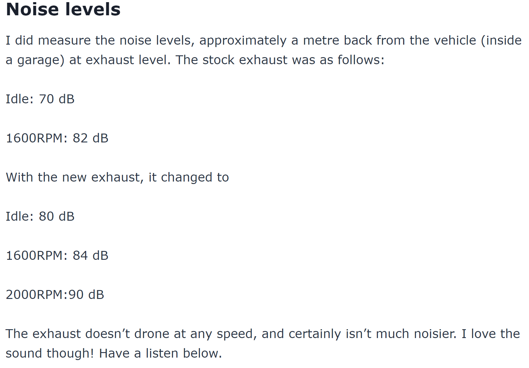 One review I read compares the decibel of a factory exhaust to the Beaudesert and its very close. See full article here