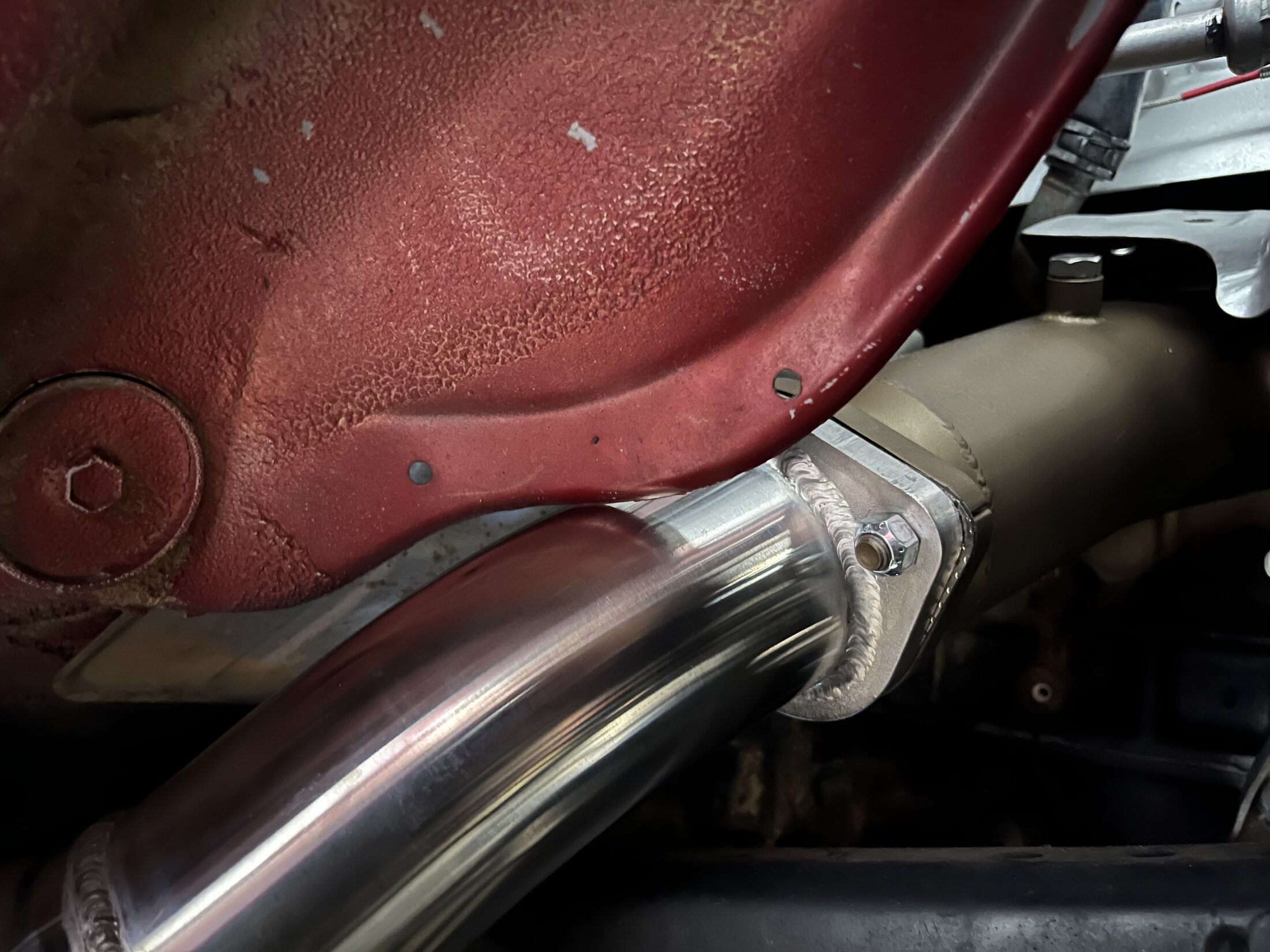 More photos of the installed exhaust. The rubbing of engine bay flex pipe below.