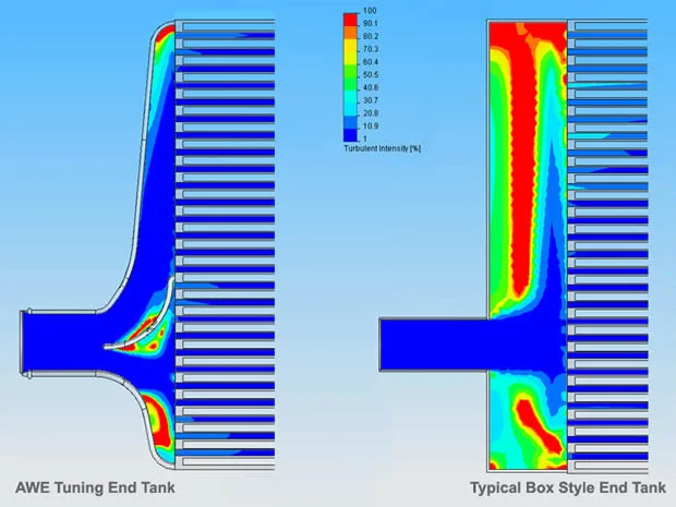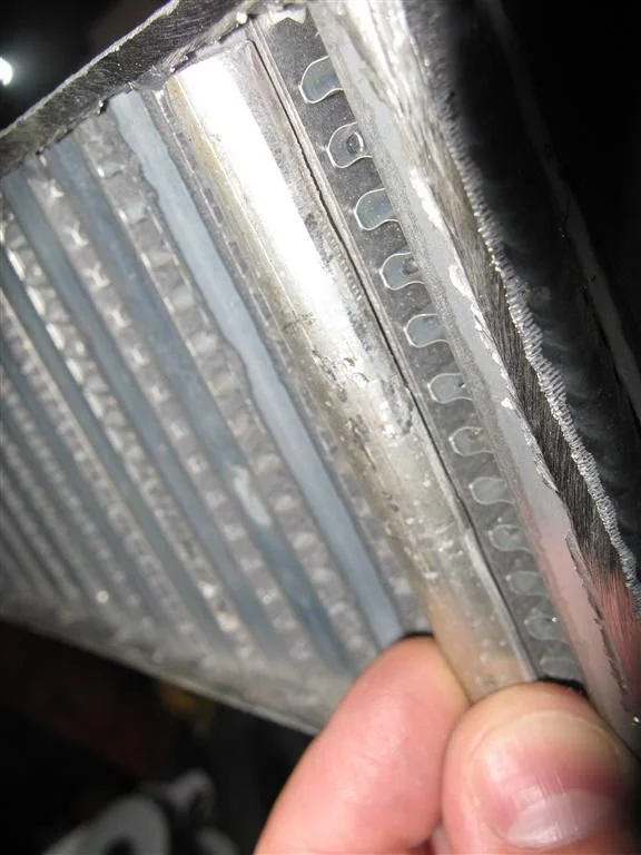 I then took some flat stock aluminum and bent it on my vice in an "s" shape and trimmed it to fit in the tank and line up with 1/2 of the passages to catch 1/2 of the intake air like this. Sorry I lost my own pics, but this is what I modeled it off of. I dont weld aluminum, but i pad a local welder 100 bucks and called it done. The improvements are to even flow across the core for efficiency and internal mods to cut back-pressure. Flame on.