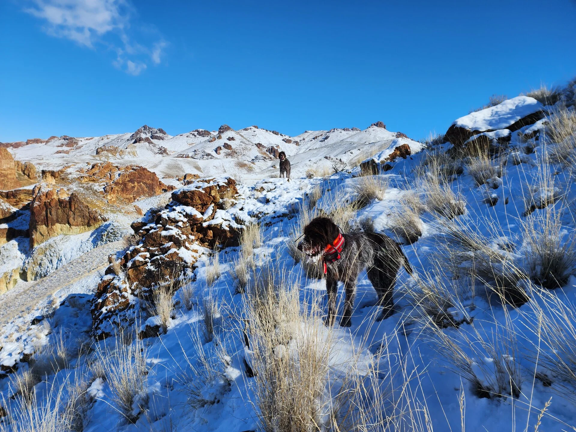 Sam (Wirehair Pointing Griffon) on point on some bandits.