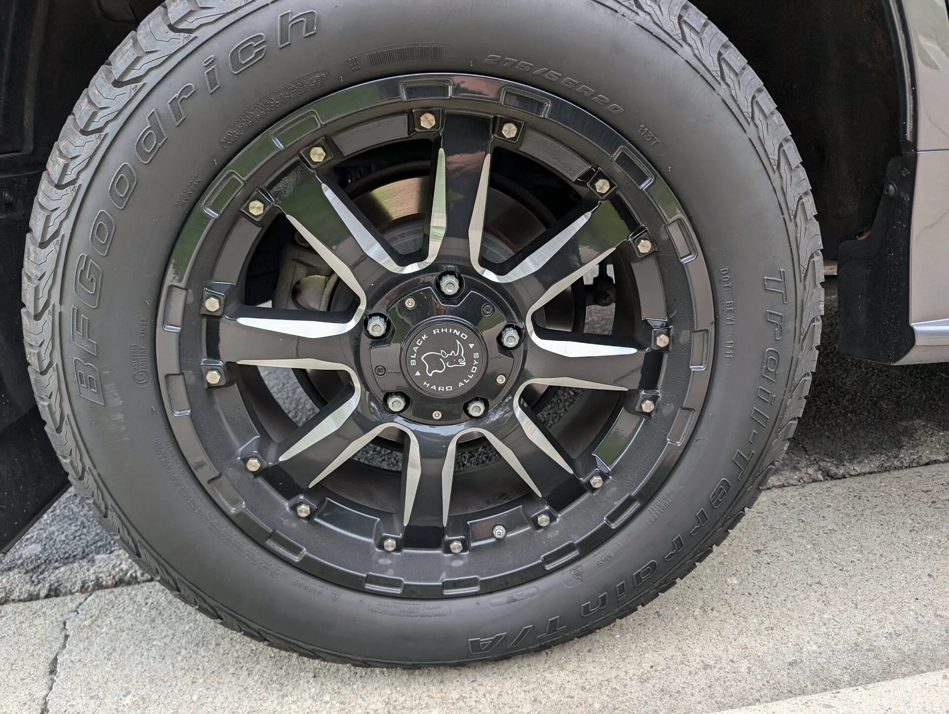 It has 20" black rhinos an BFG trail terrains 275/55/R20 in excellent shape, but it's a zero offset wheel. It looks great sticking out, but I'm worried it will hit the well when the suspension articulates.would appreciate if anyone has thoughts on that