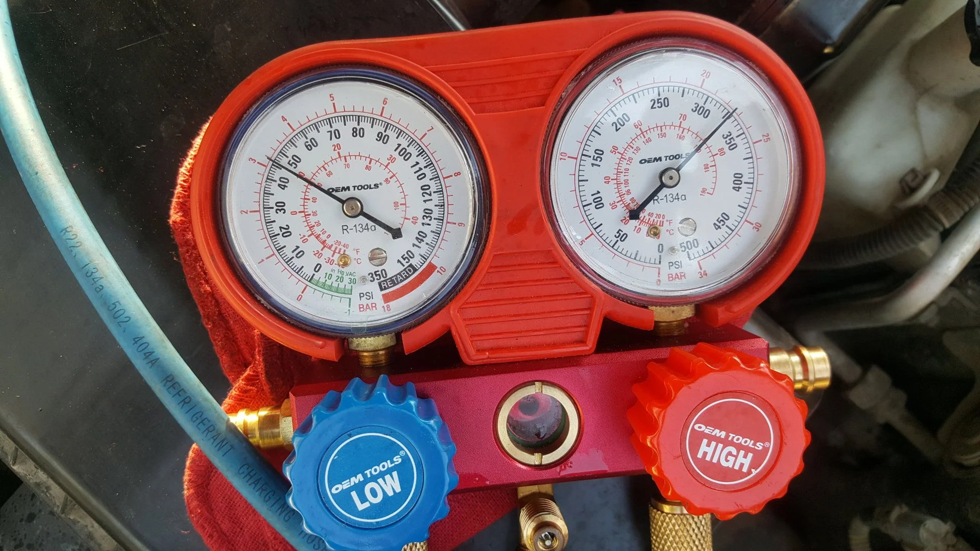 Thanks. I saw that fsm page on another thread, but am not sure how the higher, 100 degree ambient temp outside should be factored in. What year is that fsm page from? I have found different info on correct psi in various places, all show different psi for different outside temps, and all show higher than 35 psi like that fsm page shows. I also came across a tutorial that said to rev engine at 1500 rpm. I guess I should take another reading revving at 2000. Originally, i used a low pressure gauge only and followed the instructions on it, which said charge low to 47 psi for the temp that day. i added most of a 12 oz can of 134. But after doing more reading realized the low pressure only gauge is inadequate and i may have overcharged it. I returned the gauge to autozone and borrowed the complete manifold gauge, and got the reading shown in the pic. So...i need to decide either to leave it, or let some out. Any experienced opinions are greatly appreciated. ThanksYes, that's a bit too high. Should be around 35, unscientifically speaking.