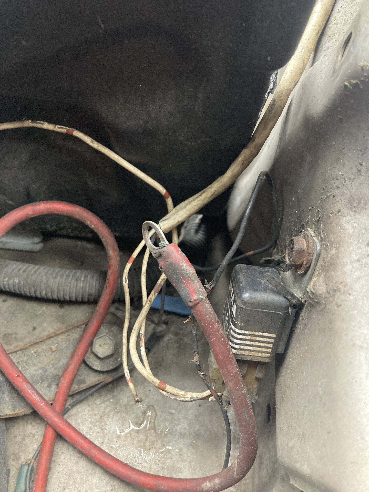 Sidenote: the top connector (mustard colored bit) of this white wire with red bands was unclipped from this little glass tube when I started poking around, what is this? The ground? The section I clipped back onto the tube was connected to the positive battery terminal with the fusible link.