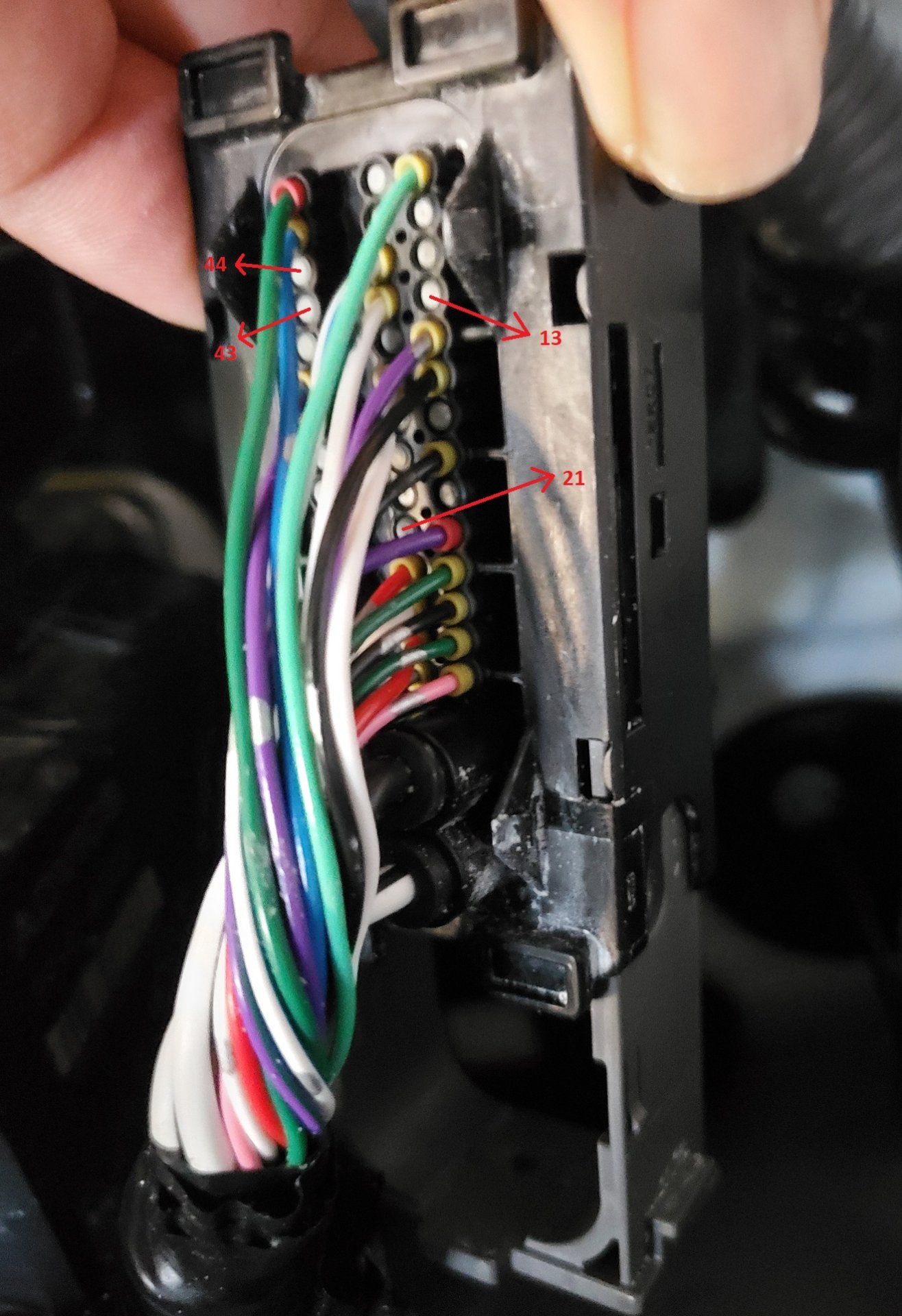 Pictures from two directions and pin numbers are: PIN43 (ON/OFF), PIN44 (DOWN), PIN13 (UP), PIN21 (GND).