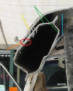 If you are squirting in a rustproofing agent, make sure you get it into the right place. I've seen a few where the gunk was only applied over the lip shown in blue. From memory that's only there to hold the headliner tensioning wires.