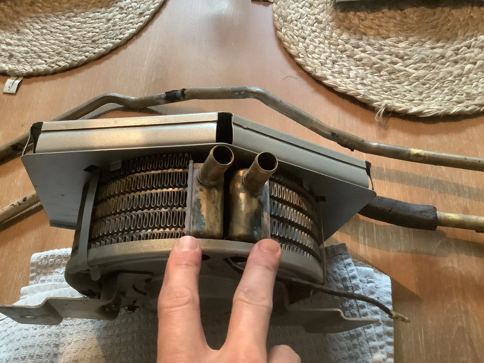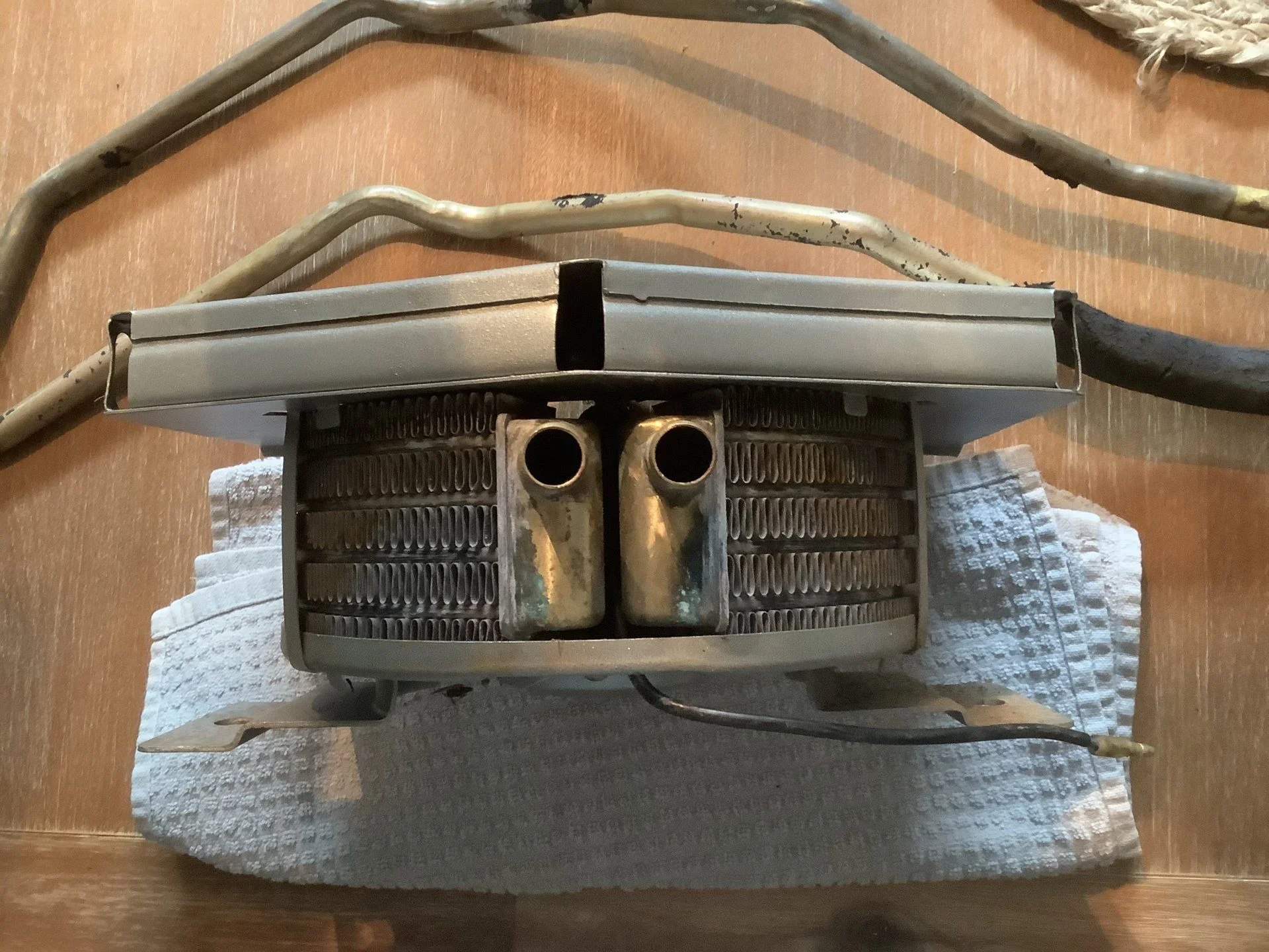 Core has leaks. I attempted to plug them with JB weld to no avail. Leaks from points indicated on pictures by peace sign.