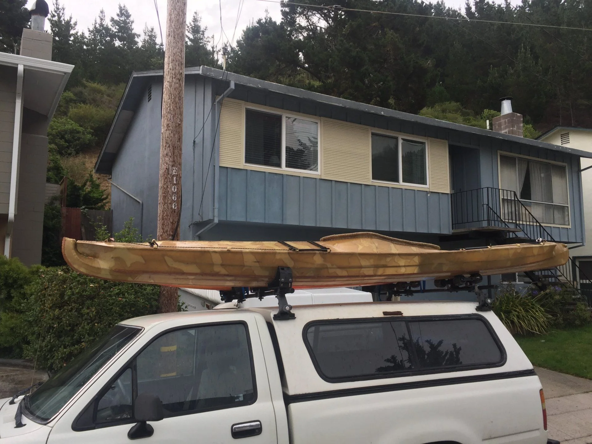 I will see your canoe and raise you one sailboat and two paddle boards. There is an Old Town Appalachian buried under all that. I use Yakima canoe mounts on my home built rack.
