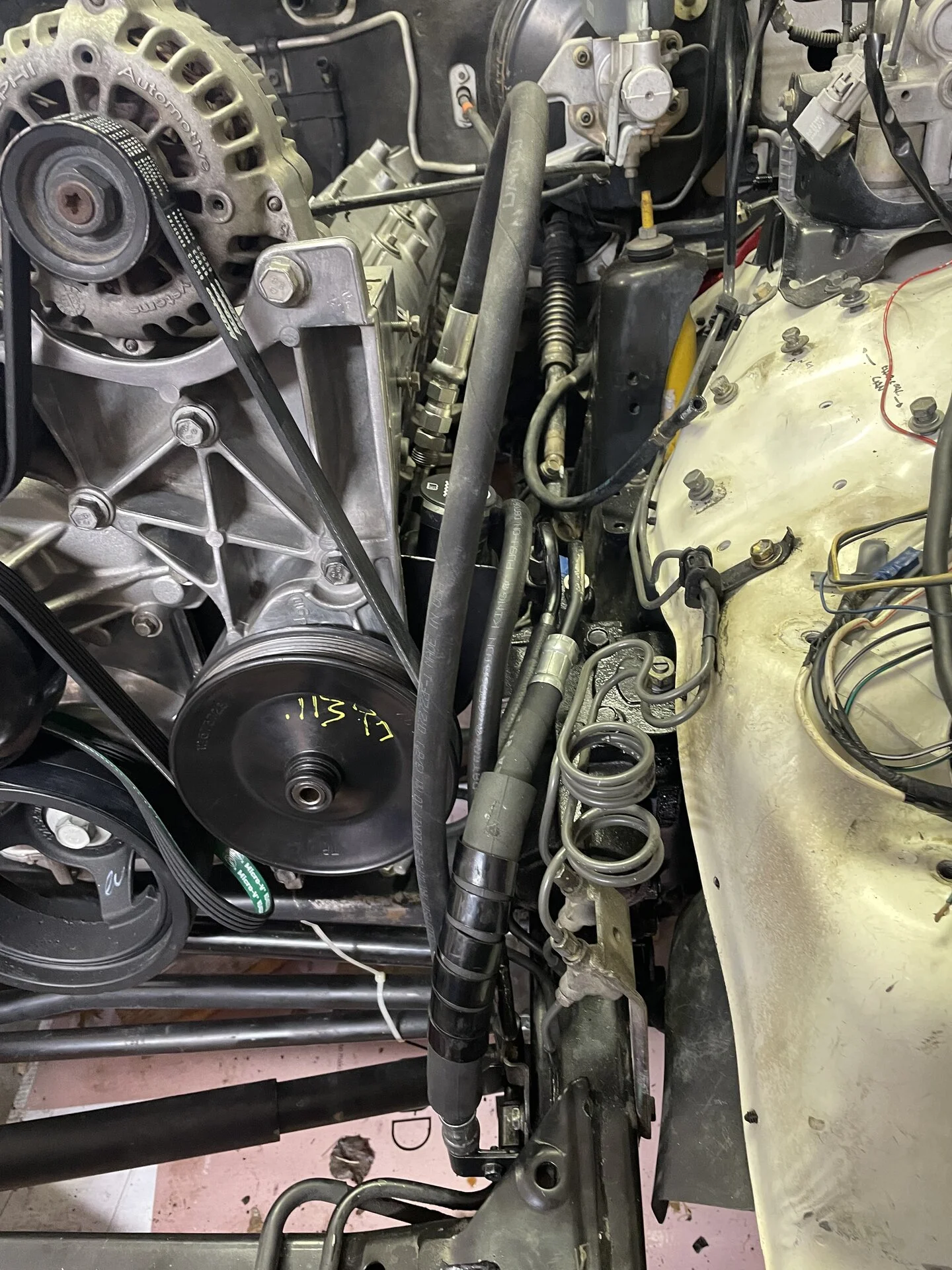 Got my power steering hoses done. Not sure I’m happy with them. I have the pressure line coming up and over where the battery block on a truck motor goes. Which I really like the idea of using. We’ll see. For now it’s hooked up. Can always change it later.