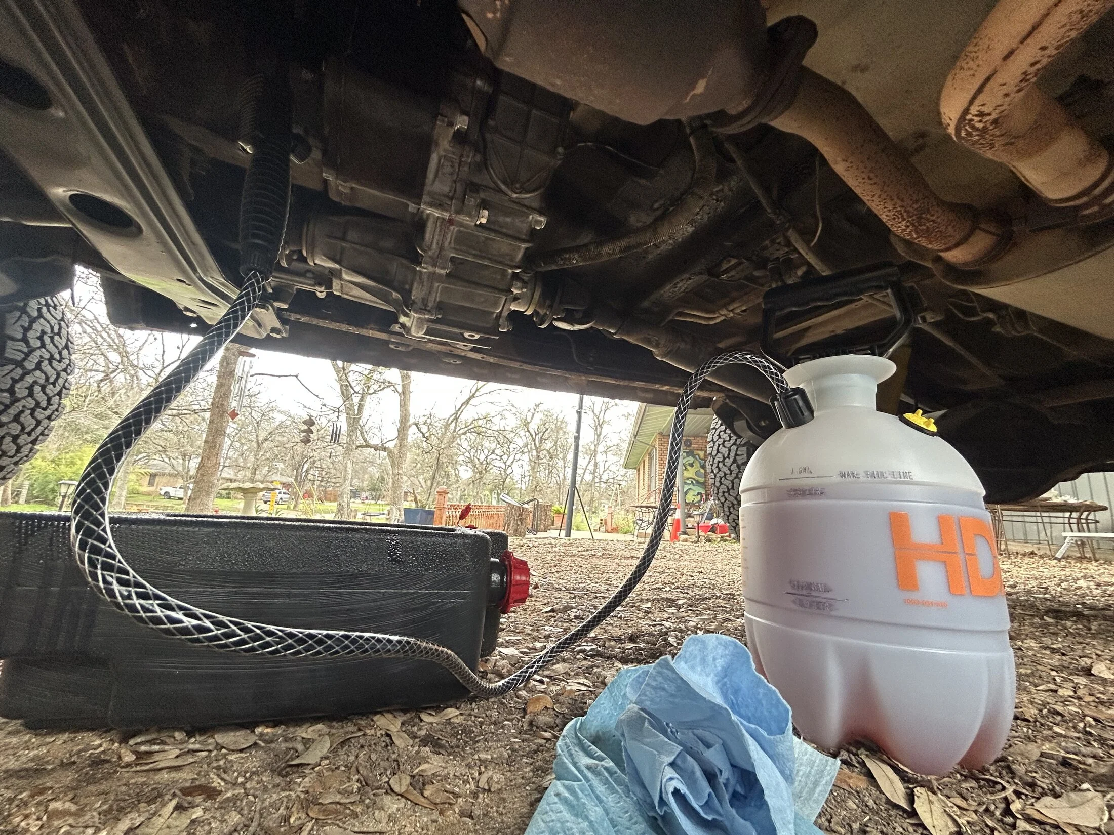 I loathe filling a transmission or t case with the stupid pump things from the auto parts store. I made this. Works well, if not a bit slow. At least I’m not covered in gear oil.