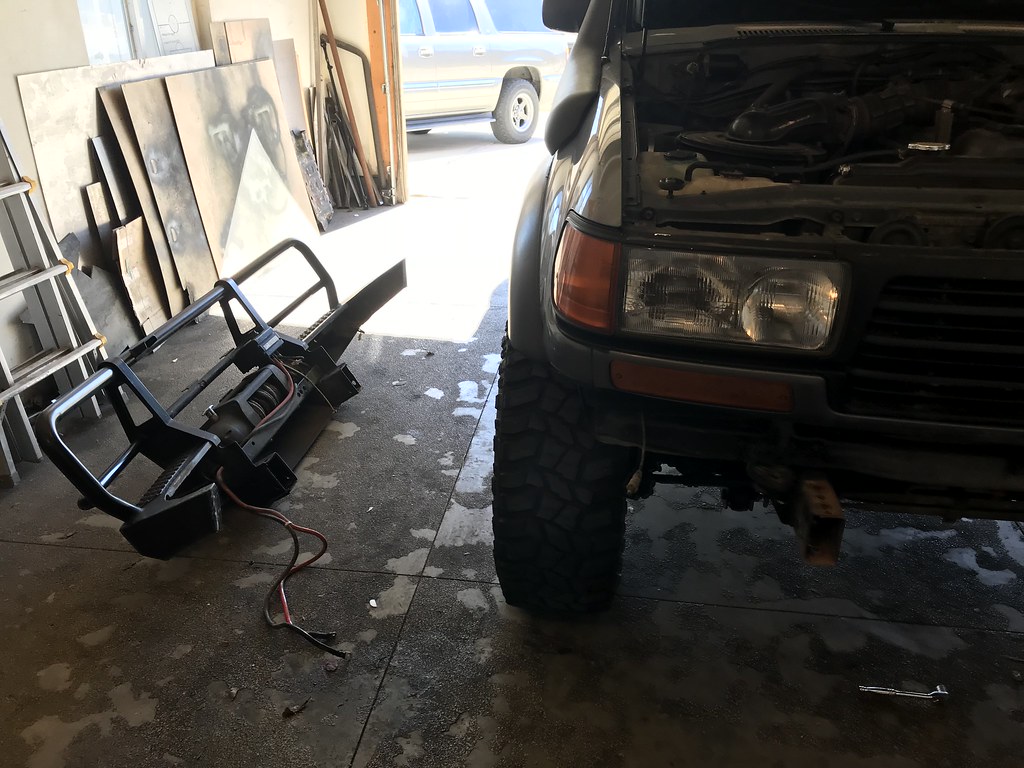 Found this pic with the bumper off. Not really easy to see but you can see the winch plate (I got it from Harbor Freight) that the winch is mounted to. I had to cut the ends down a bit to fit between the bumper uprights. You could also choose to put the plate at the bottom of the frame brackets if you want the winch to sit a little lower but putting it on top of the frame brackets like I did worked fine and put the line in a good place where it exited the bumper.