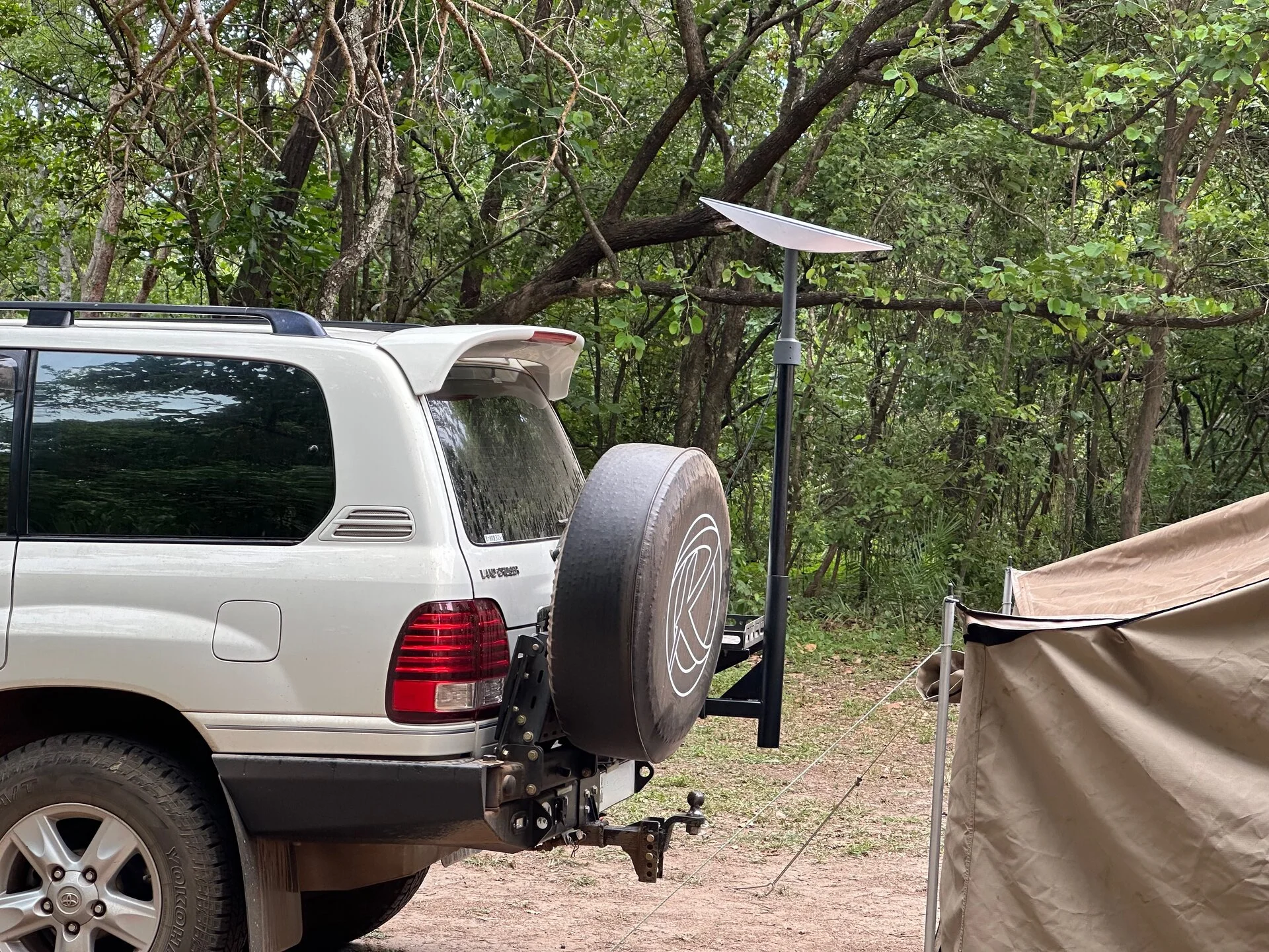 The camp spot was nice, with a "boma" structure and a camp attendant who would boil water for us to use for showers (not that we needed to rely on that, since the trailer is equipped with a shower setup including an instant propane water heater and 120 liters of water). There is no cell phone signal in this area, no electricity, and definitely no internet...so it was the perfect first test run for our mobile Starlink setup. See if you can spot it in this pic...