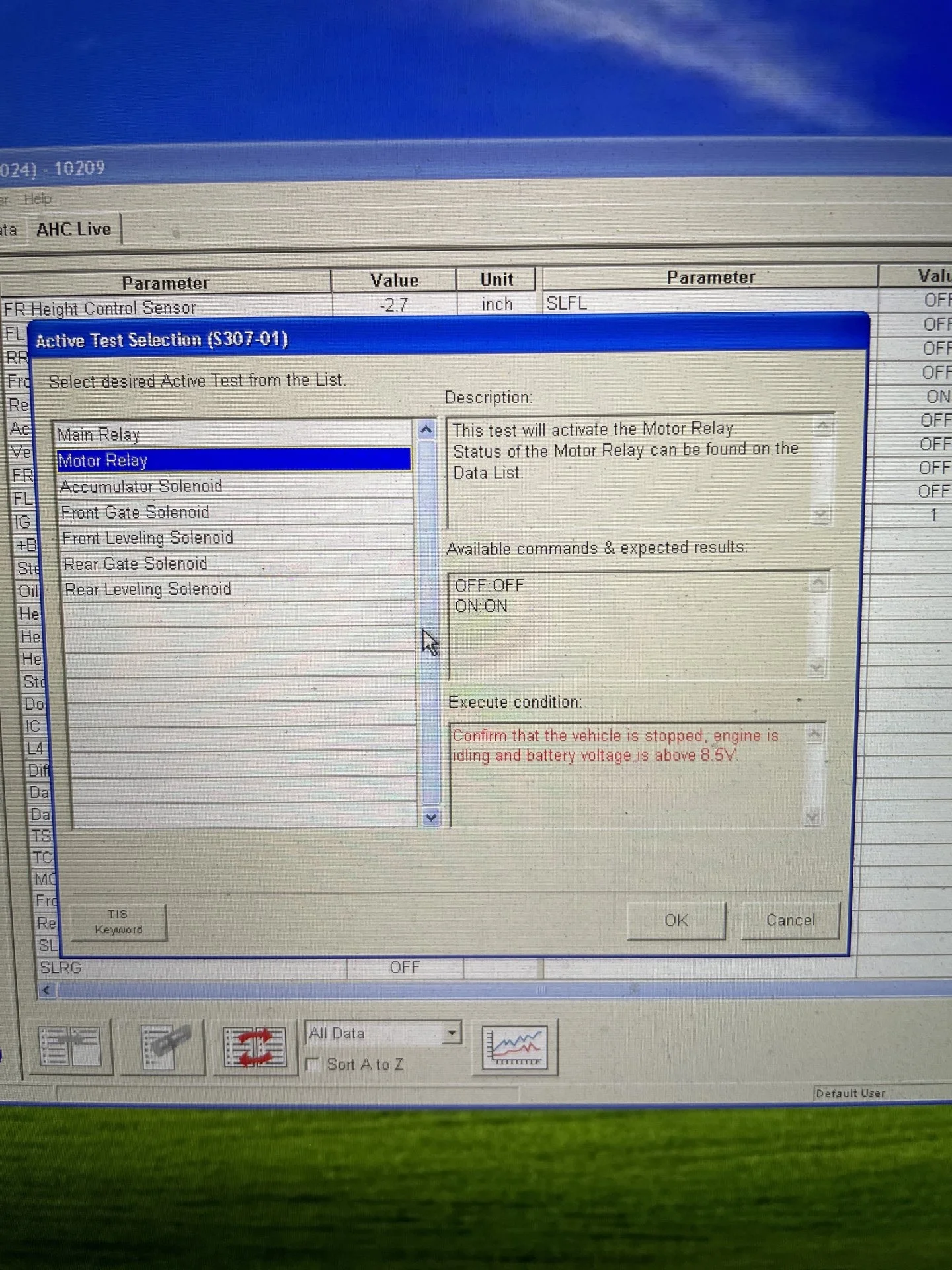 Perfect. I think motor relay is your jam here. That should forcefully run the pump... I think. I'd run that for 10 seconds, bleed, repeat, etc... Until you can get the pump to run with idling and maybe a height change command.
