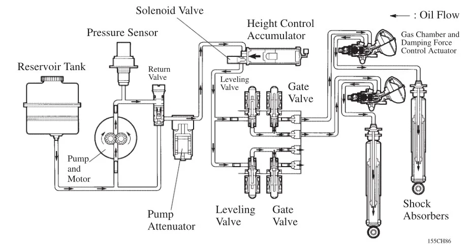 • When the Height Control Operation Test (“Active Test”) can work correctly, the ECU causes the AHC Pump to operate and also causes the Levelling Valves in the Control Valve Assembly to open as required to allow the vehicle to be raised or lowered,