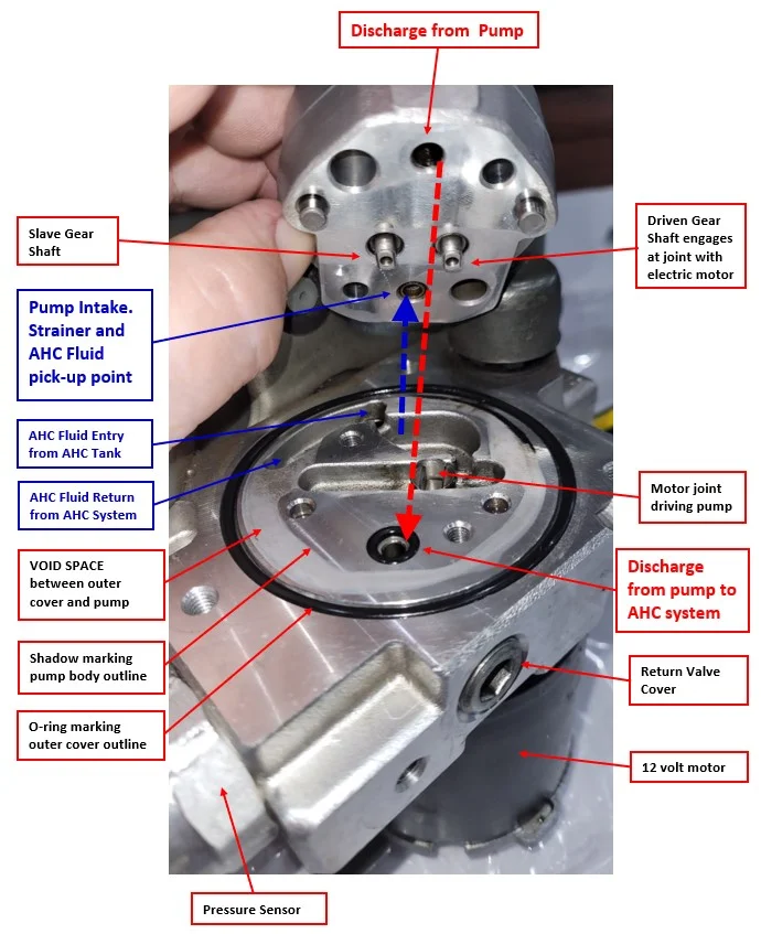 • disinterested in repairing the existing AHC Pump -- clean the internal strainers, replace internal O-rings above the gear-cases, etc, etc -- this is not difficult -- been there, done that, reported on it -- can be successful but it is still a 22 years old pump with unseen wear and tear!