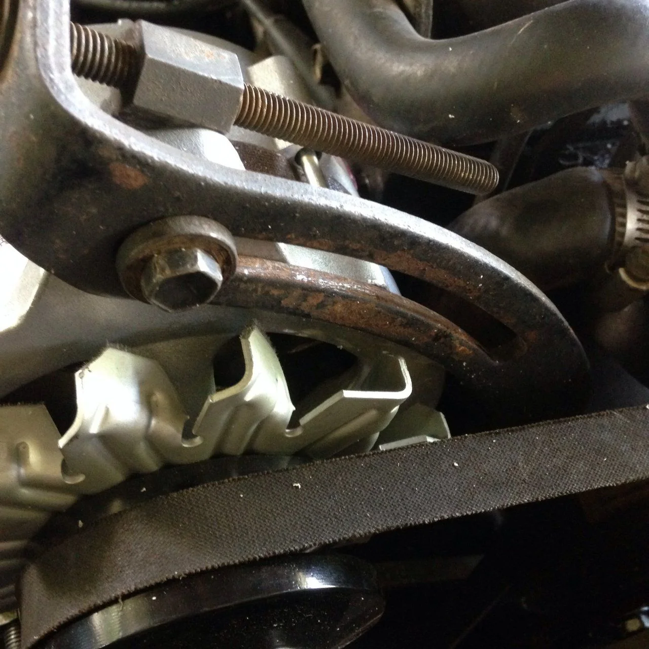 You need a shorter belt. Your belt looks loose and you appear to be out of adjustment room.