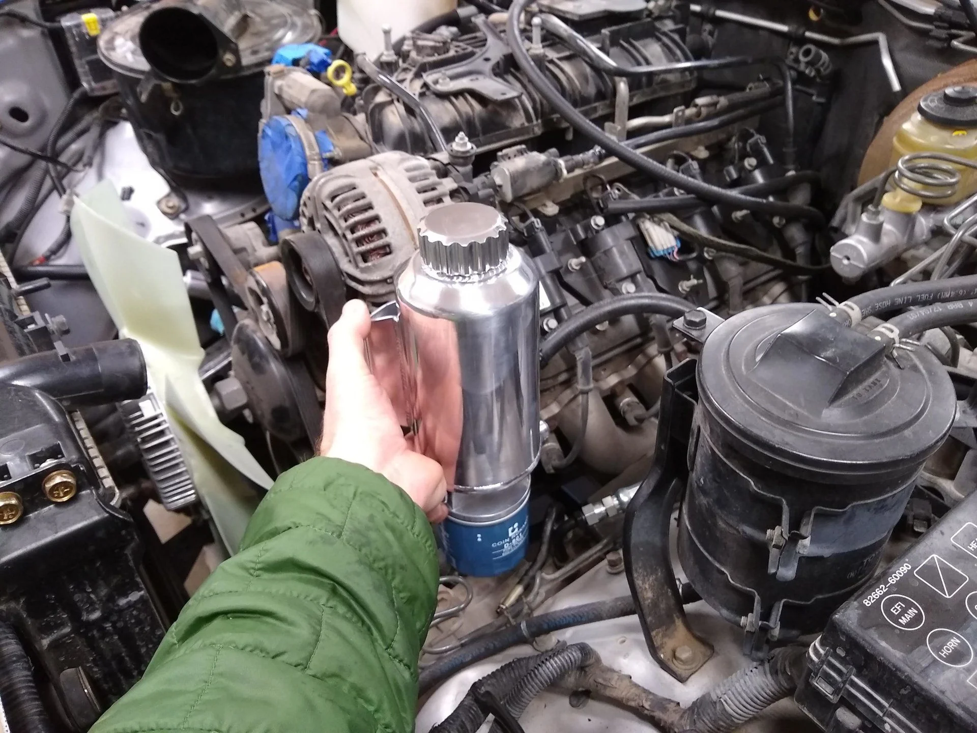 Install it all and cut some hoses to plumb it all in, and this small project draws to a close. I used three fasteners each on the bracket and the reservoir. I drilled and tapped a third hole on the alternator bracket to react the forces developed by having the reservoir stood off the bracket, and on the reservoir, because I thought it looked more pleasing to the eye. Truth be told, if I had it to do over again. I would not have used a reservoir this size. I like the added volume and I really like the that it has a filter, but it is at the limit of space available for it. Its done, it fits, and it will be fine.