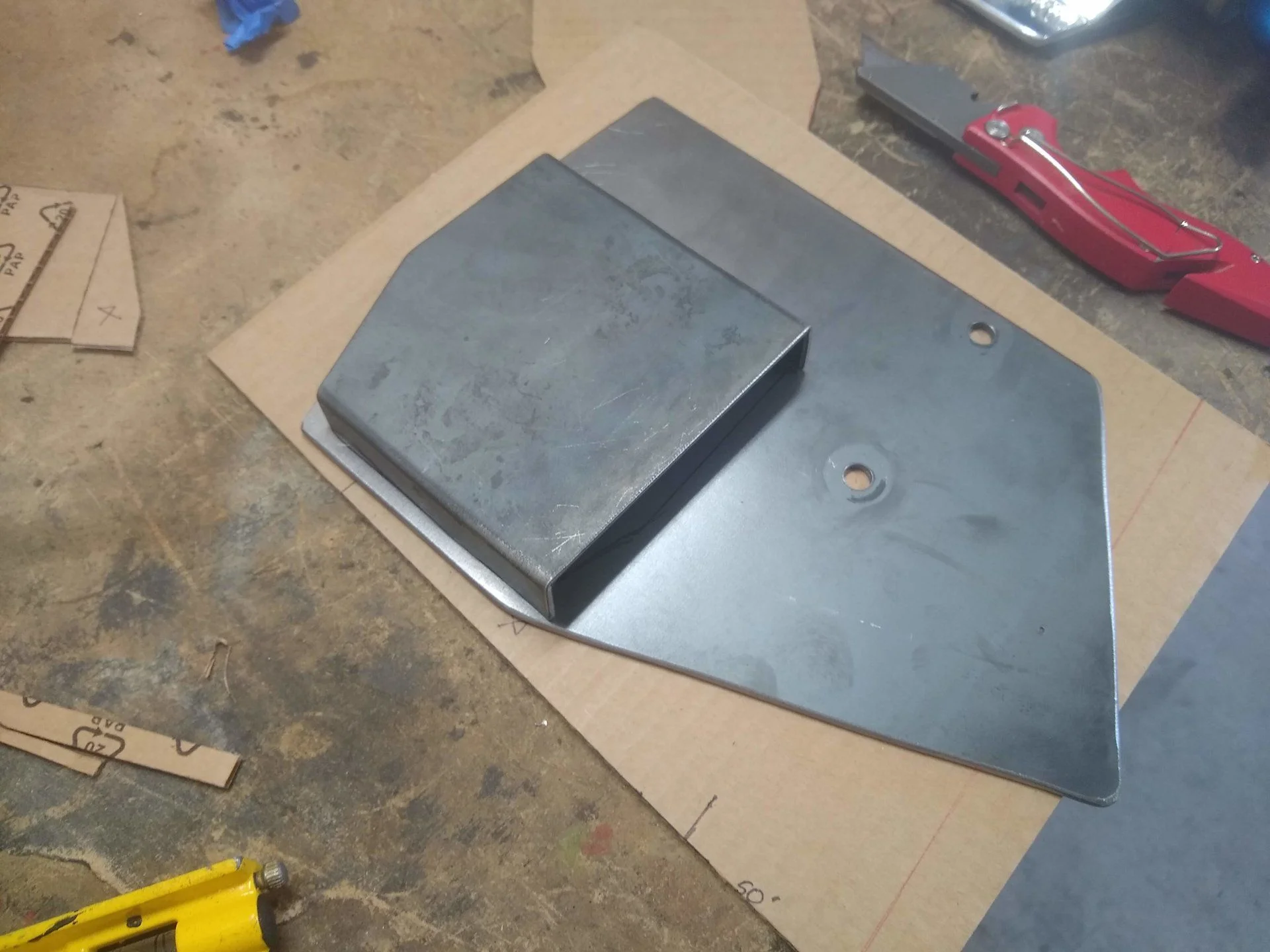 Long weekend and a bit more progress. I keep thinking of this in terms of eating an elephant. Solve one problem at a time and then another, and another. Eventually, you run out of problems. I still have problems, but two less than before. I was able to get the PS reservoir mounted and plumbed. Work started with a CAD template. I sketched out the shape and kept whittling it down until it fit the space and left a little real estate for some future items if needed. I transferred that to some 3mm plate and cut it out. A little deburring, and it was ready for the bolt pattern to be transferred and drilled.