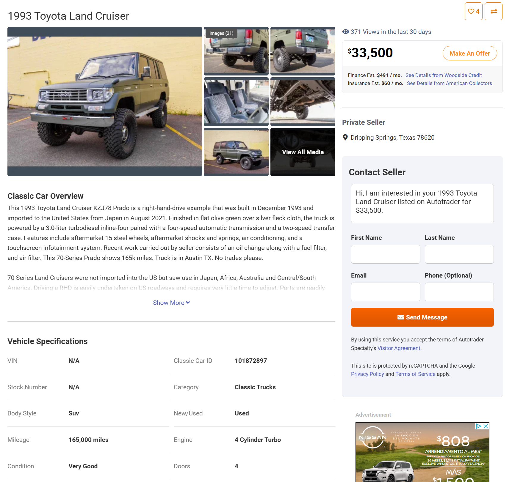 This 1993 Toyota Land Cruiser KZJ78 Prado is a right-hand-drive example that was built in December 1993 and imported to the United States from Japan in August 2021. Finished in flat olive green over silver fleck cloth, the truck is powered by a 3.0-liter turbodiesel inline-four paired with a four-speed automatic transmission and a two-speed transfer case. Features include aftermarket 15” steel wheels, aftermarket shocks and springs, air conditioning, and a touchscreen infotainment system. Recent work carried out by seller consists of an oil change along with a fuel filter, and air filter. This 70-Series Prado shows 165k miles. Truck is in Austin TX.