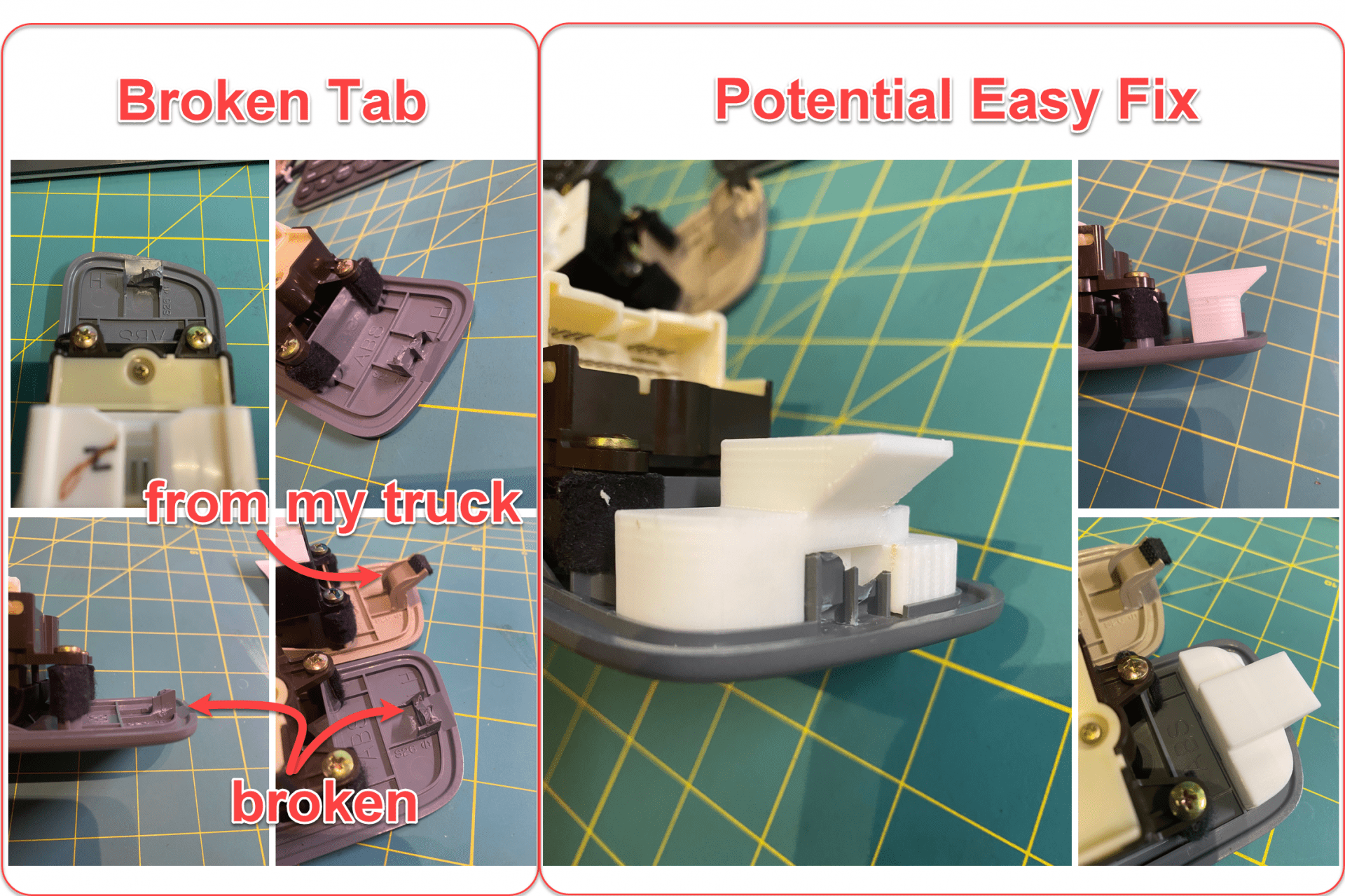 I am glad I helped and solved your problem. This is not a hard project. It took me about one hour on CAD and a couple of prototypes to have a perfect fit. I am going to give the easy fix a Make number, probably Make 24.So I didn't know about this thread till last week. I read over the first few pages and I see people talking about broken switchplates, and I am a member in good standing in that community. I read and read and read, and nobody addresses the switchplate problem that costs $600 to fix with Toyota parts. Unless you own 2003 and later, then it's like $75 or something. I read for days hoping somebody pushed forward with this. I mean I read 40 something pages cause I just know somebody had to want to fix this. Nope, crickets only!