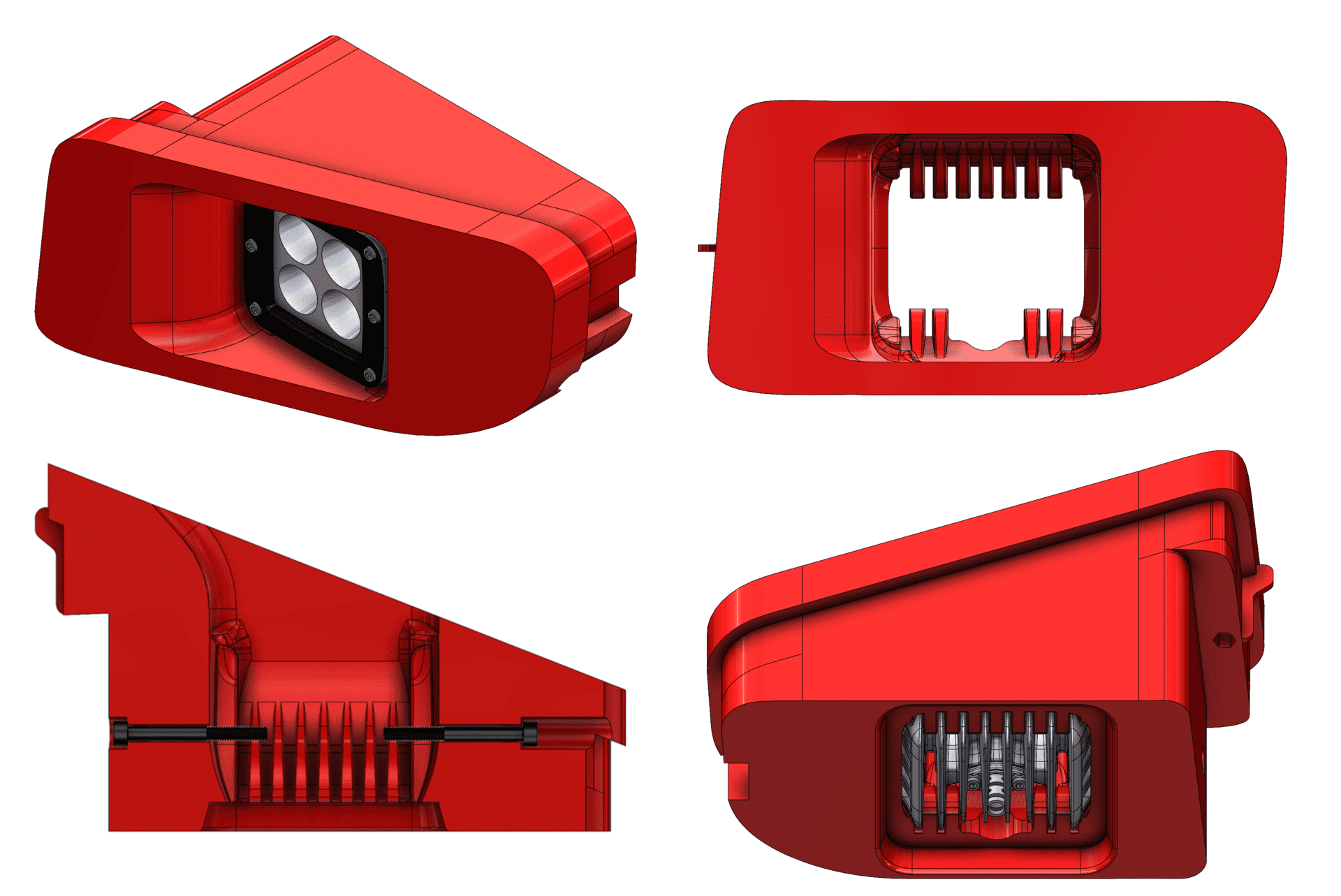 I changed the design to only mount one Rigid Industries D2 light instead of two. Mounting two is still possible but the wall thickness of the mount is pushed to several millimeters. I will explore the design for two D2 lights later. The major distinguish feature is the embedded flow deflectors. Without the deflectors, air would just pass the heatsink fins. I used to put D2 lights in confined space and they heat up quickly. With the deflectors, air should be directed to cover larger area of the heatsink fins.