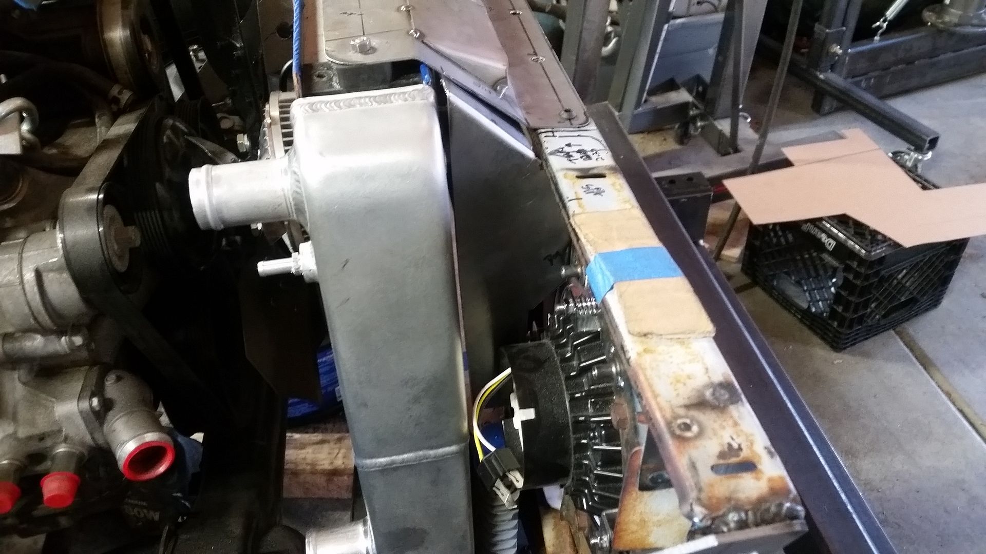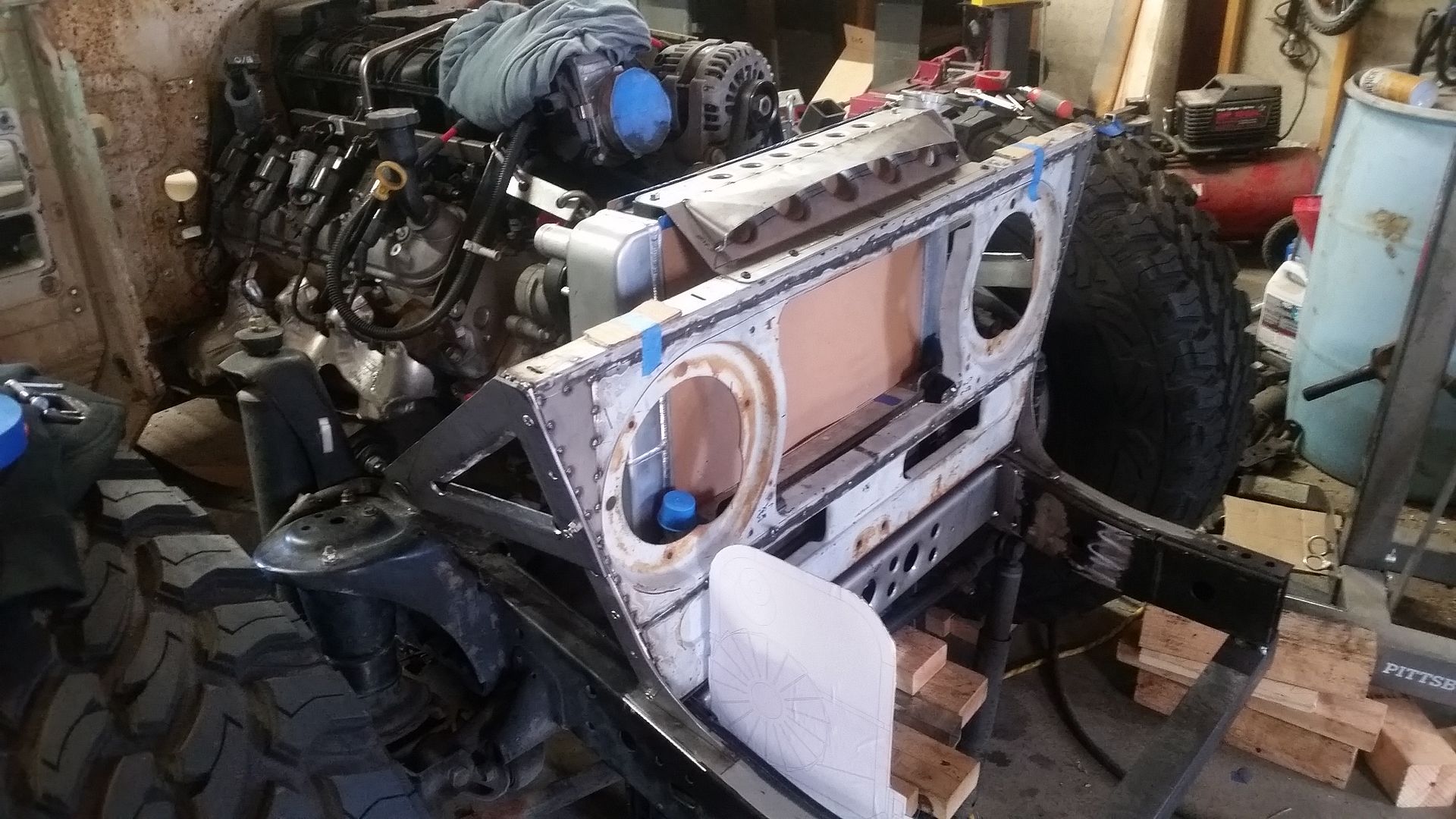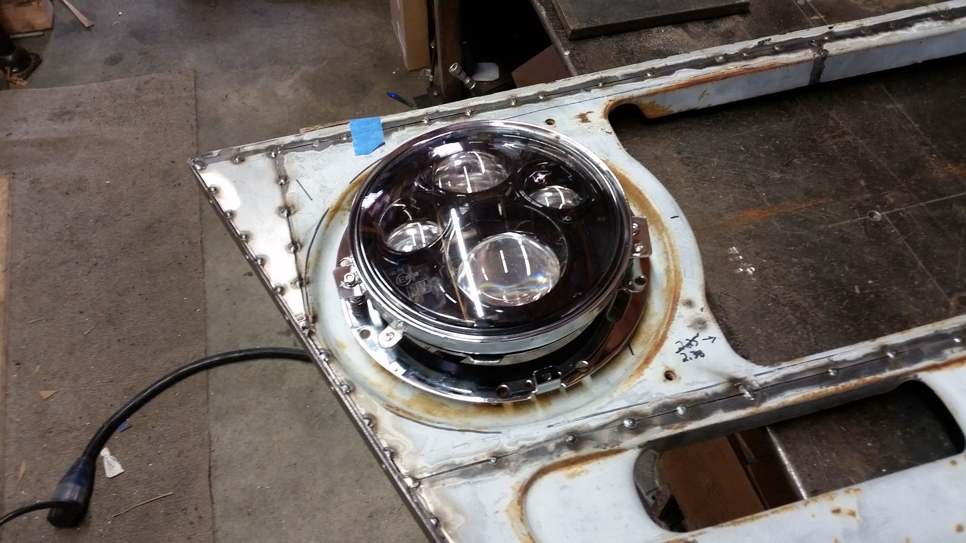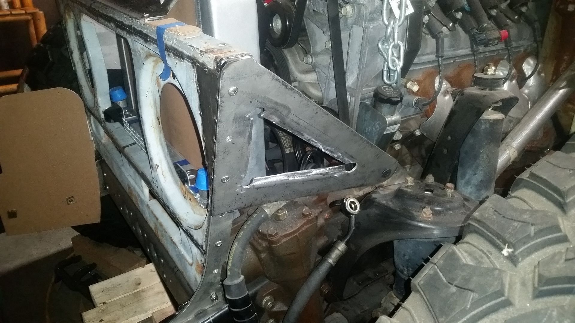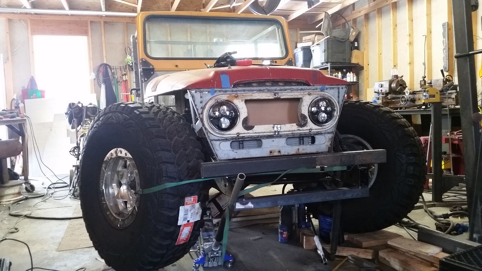 I think this is the most complete the front end has been so far. I was able to tack weld the upper mount scoop in place. I made the lower air damn that bolts to the lower radiator mounts. I mounted the headlight adjusters in the FJ40 grille. The headlights where mounted in the new adjusters. I test fit the bezel. Finished off the upper brace on the passenger side.
