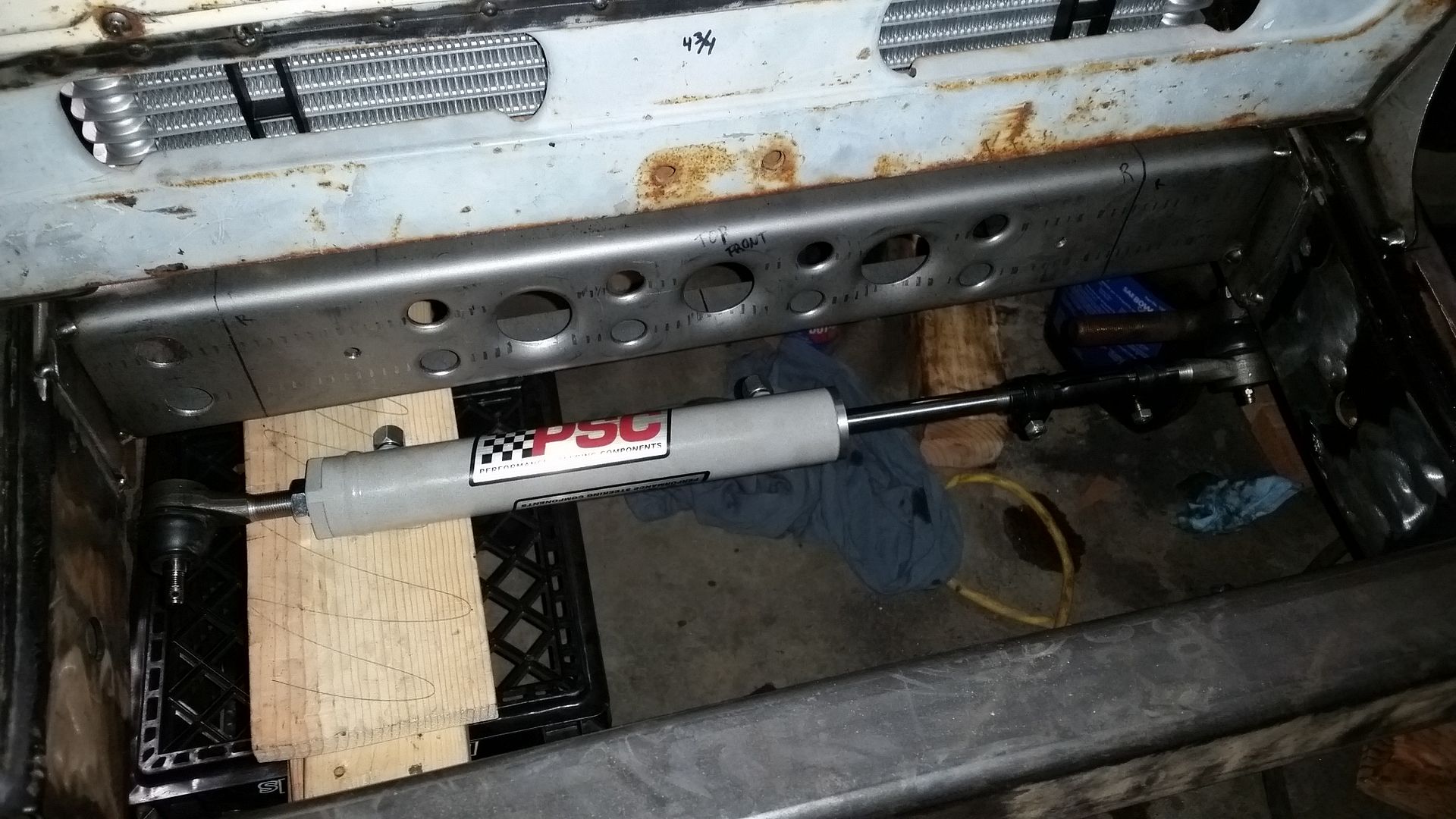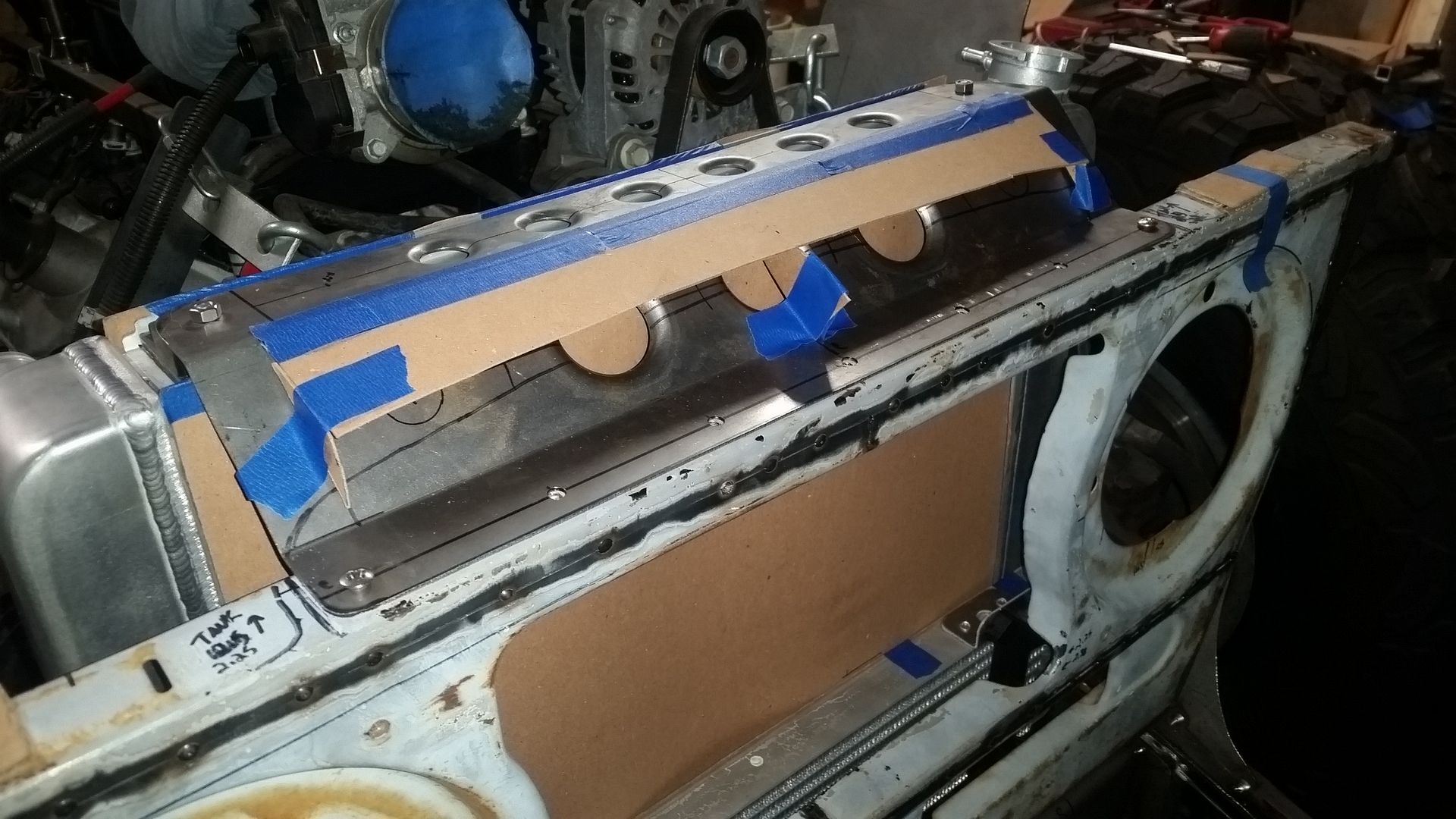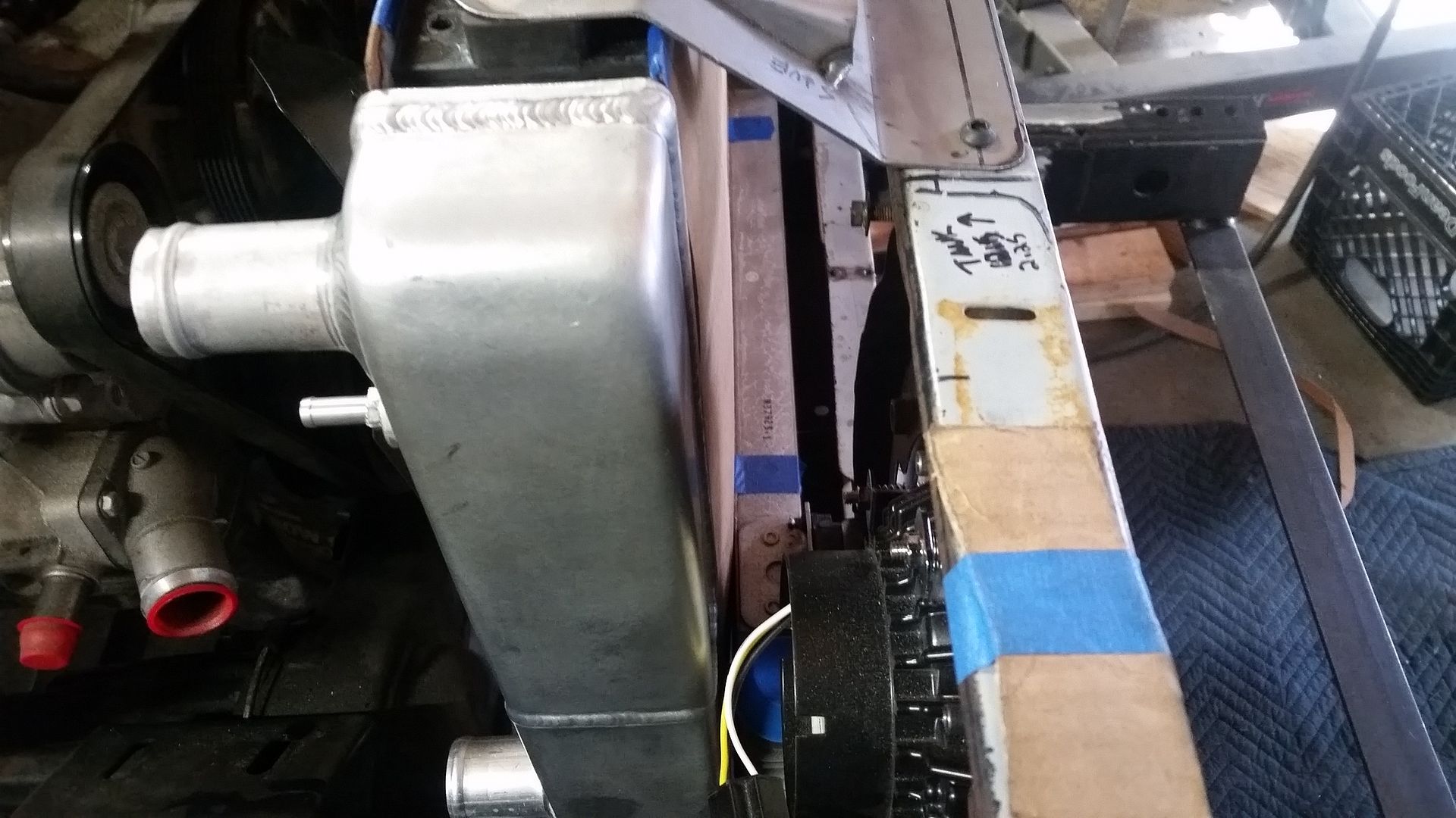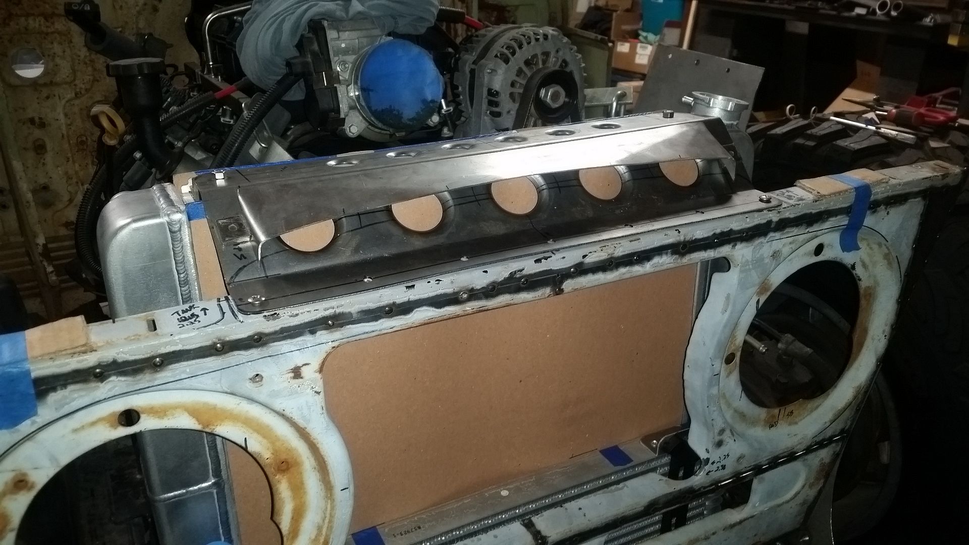 I think this is the most complete the front end has been so far. I was able to tack weld the upper mount scoop in place. I made the lower air damn that bolts to the lower radiator mounts. I mounted the headlight adjusters in the FJ40 grille. The headlights where mounted in the new adjusters. I test fit the bezel. Finished off the upper brace on the passenger side.