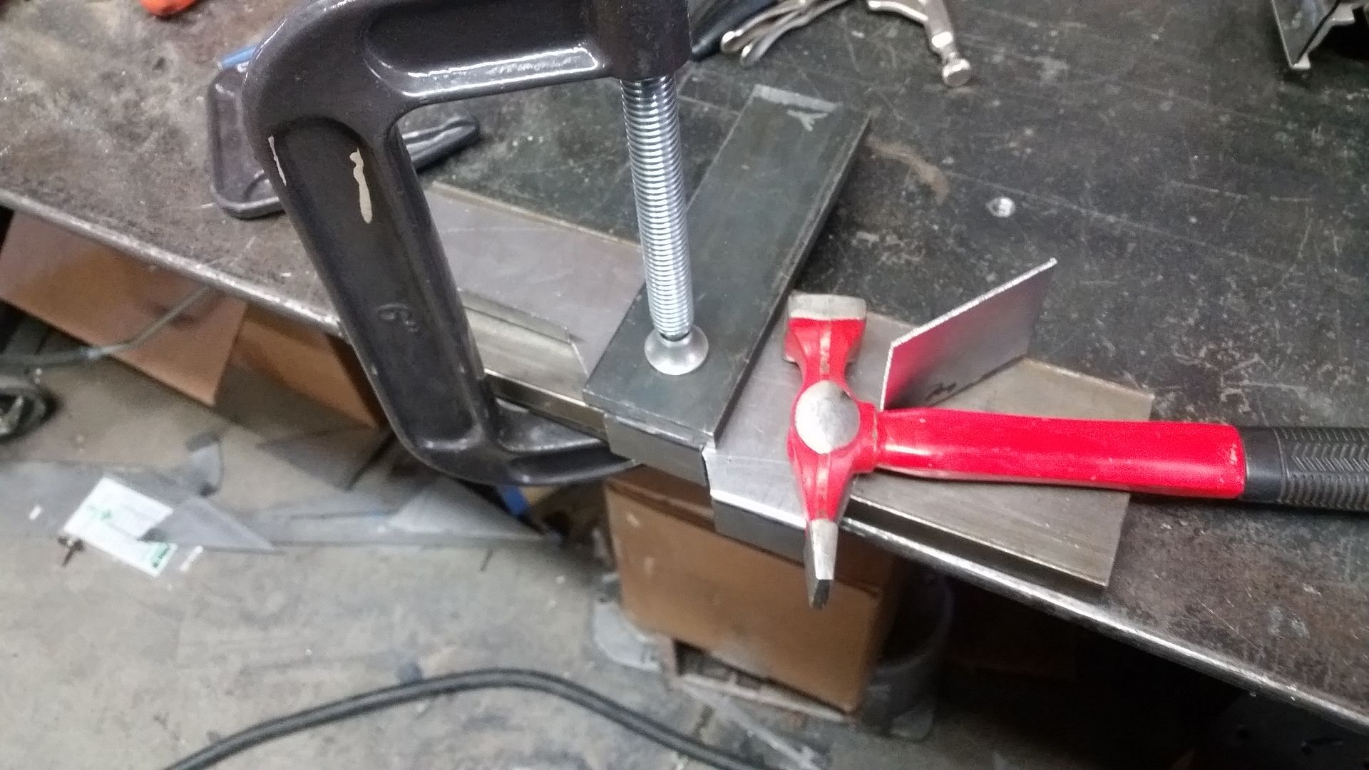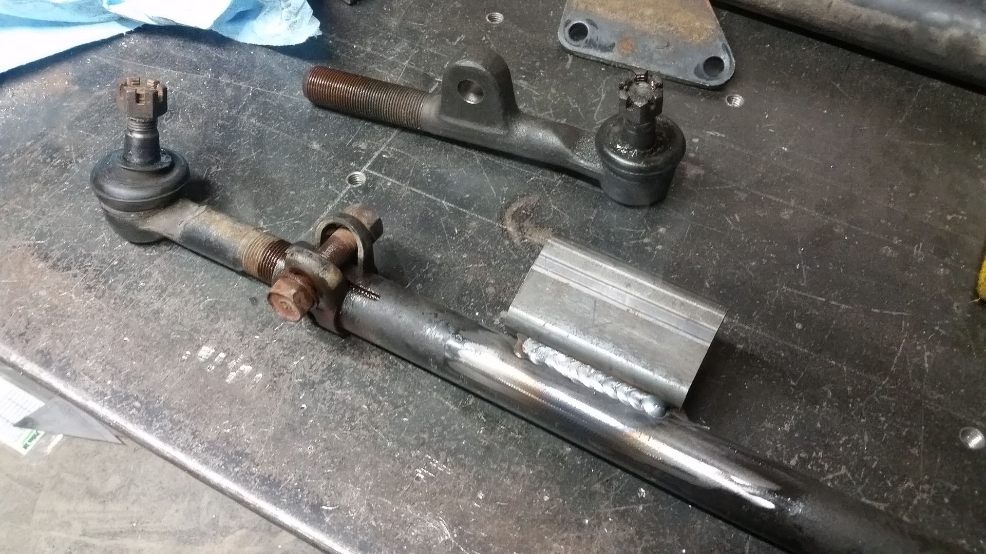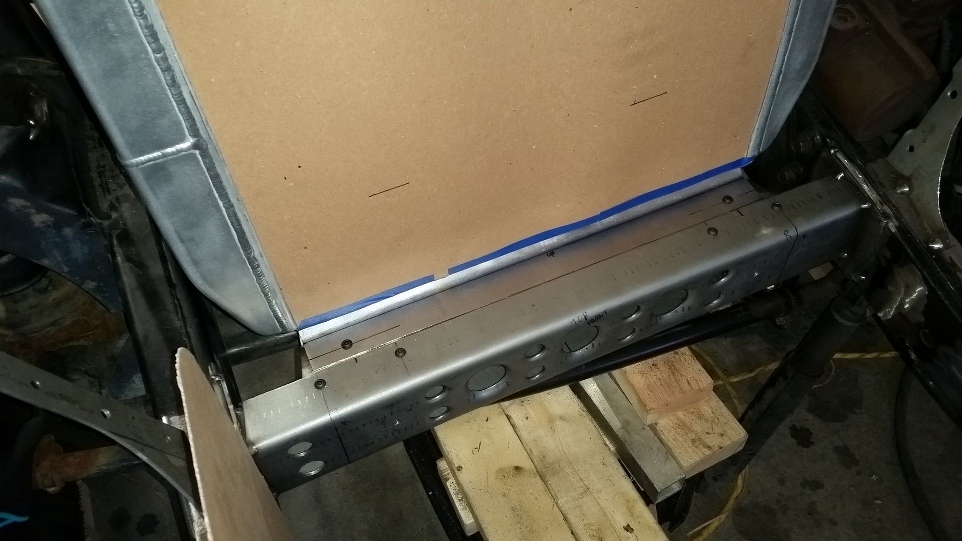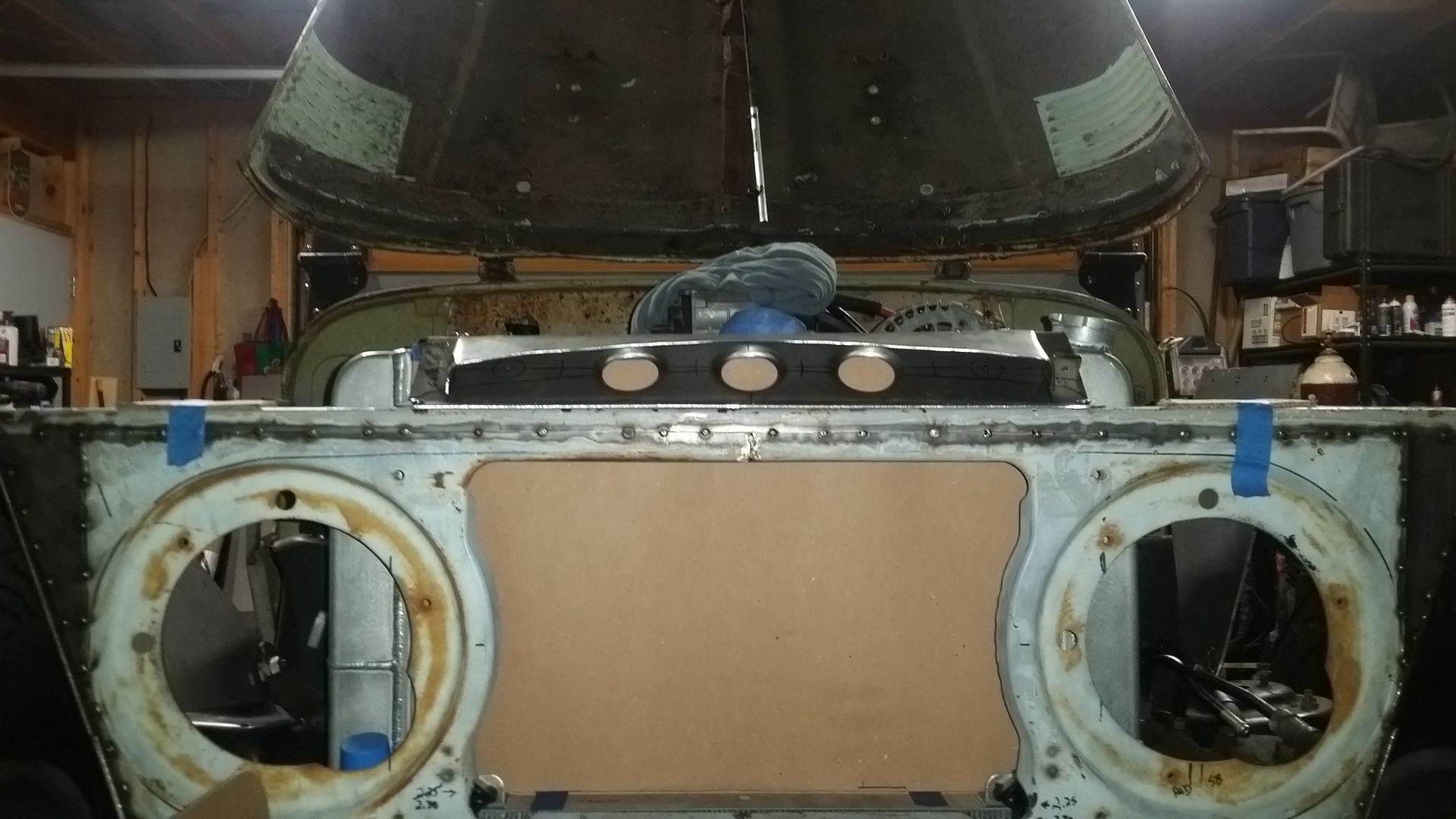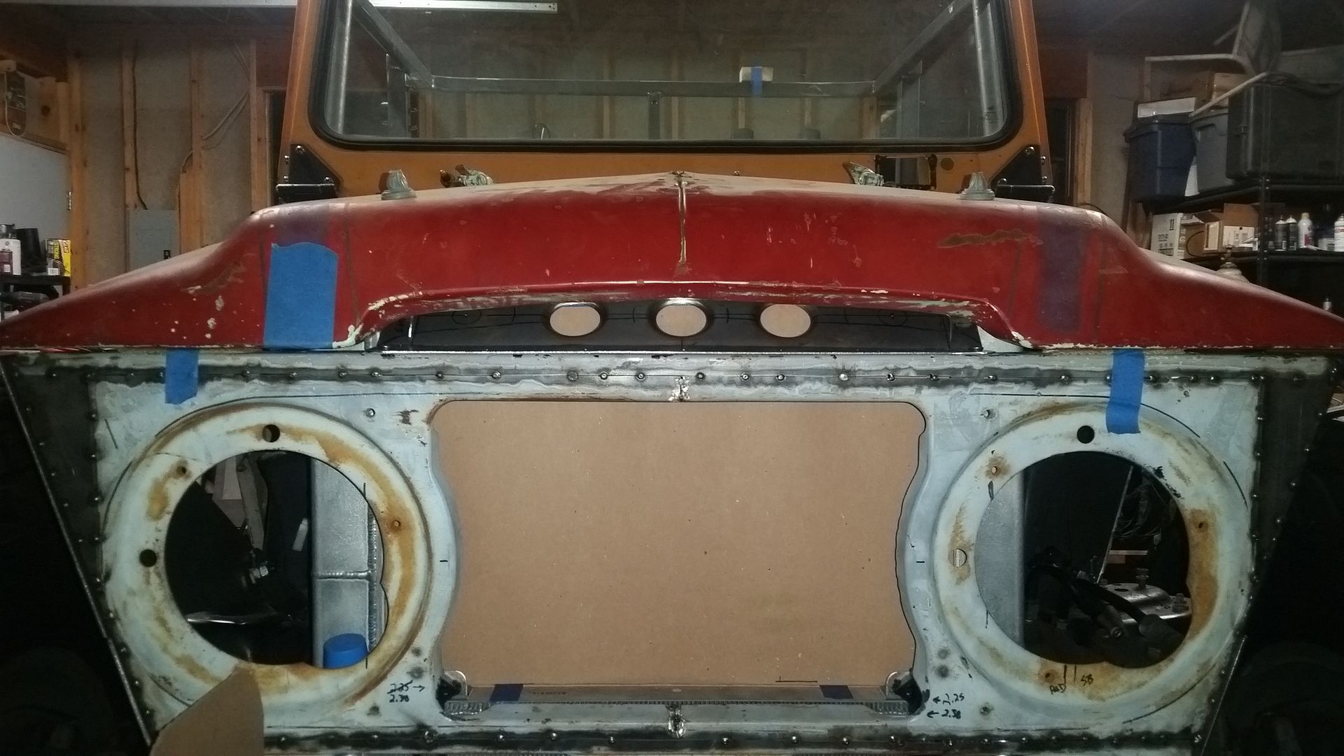 I think this is the most complete the front end has been so far. I was able to tack weld the upper mount scoop in place. I made the lower air damn that bolts to the lower radiator mounts. I mounted the headlight adjusters in the FJ40 grille. The headlights where mounted in the new adjusters. I test fit the bezel. Finished off the upper brace on the passenger side.