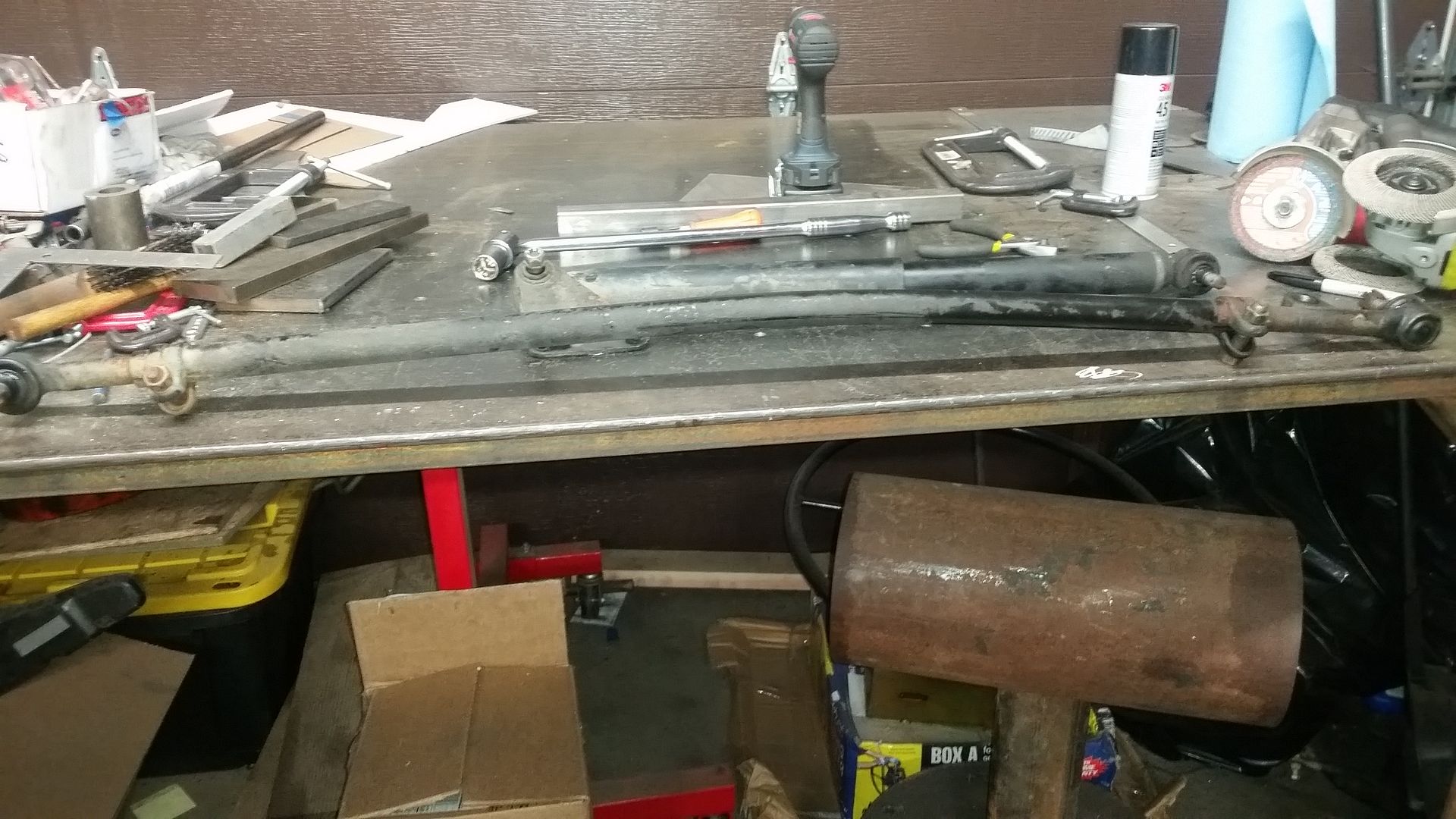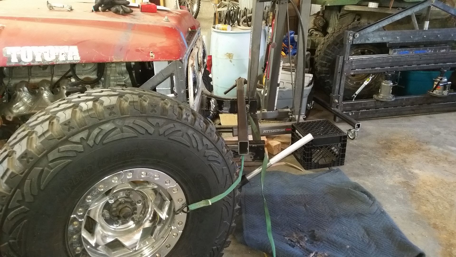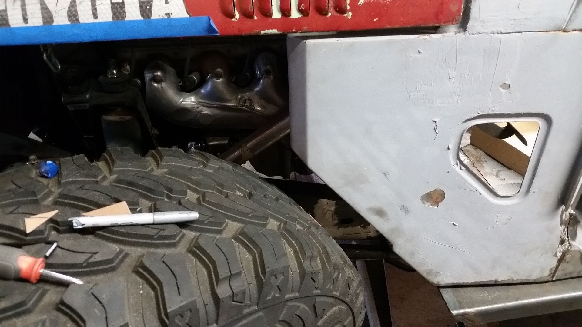 Once I had all that done I decided to assemble the front end and see how things looked. I even moved the tires around to see how the clearance is looking everywhere. I think you can see why I had to remove the 'corner' in the grill for tire clearance with the big 40s! This is at full bump, but without the axle articulated. I still have some room to work with and that is a good thing.....