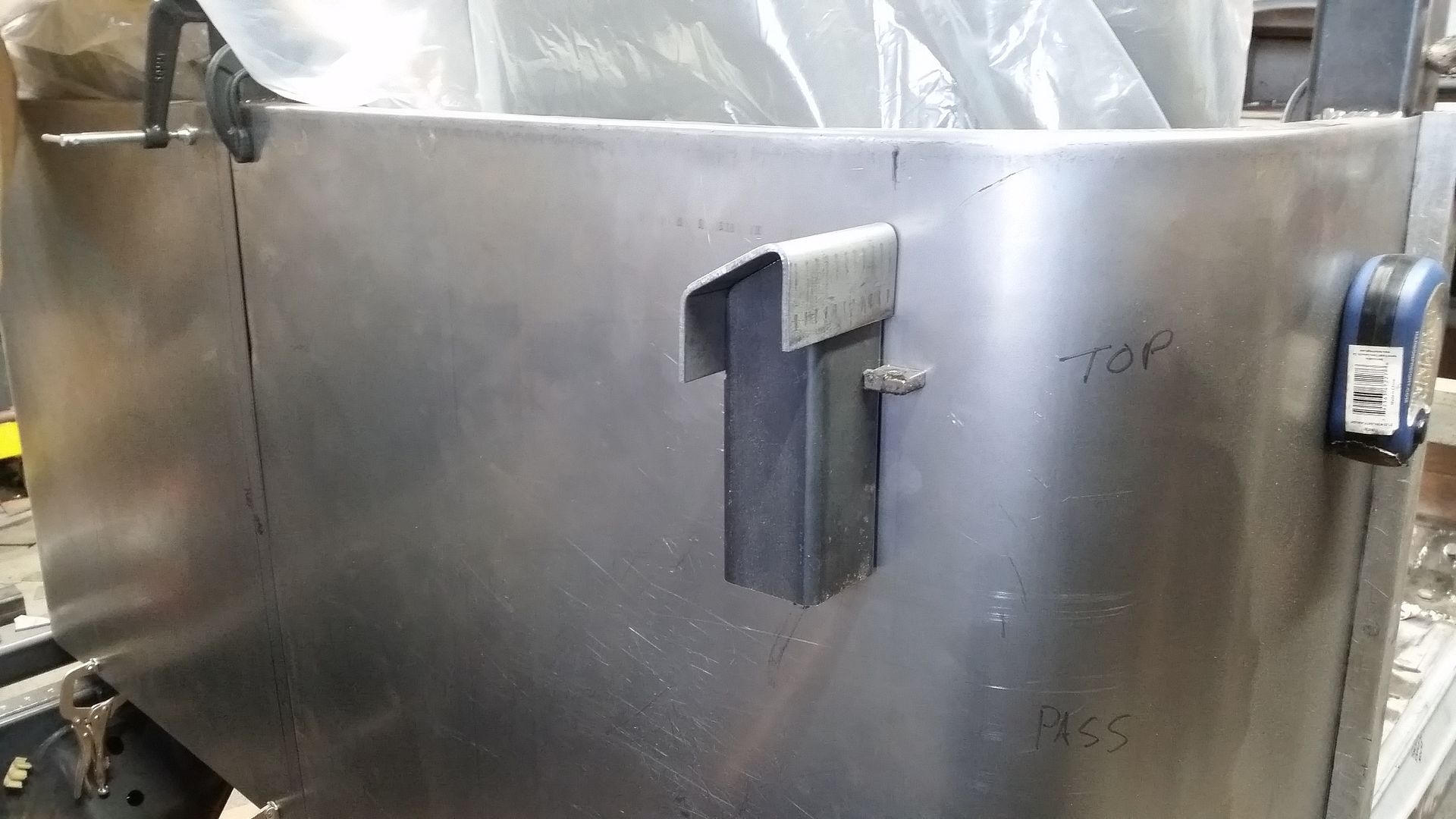 Mig with a lot of torch movement in an extended cursive 'o' pattern. The runs on stuff like this are pretty short because of all the position changes. You can see the start/stop points in the heat effected zones. The average bead length is only about 2 inches before I have to change positions. Heat is on the upper end for the thickness and wire speed reduced to slow things down. I usually have to add a half a number of wire speed for anything inverted.