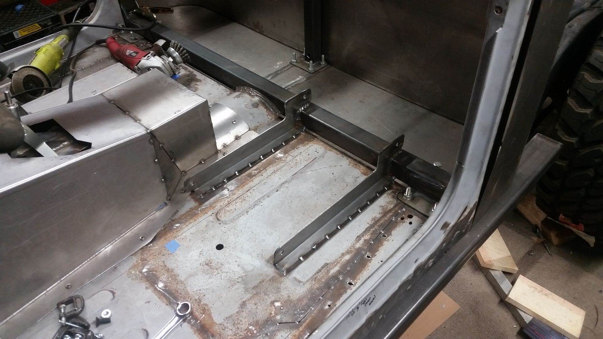 I will make a matching L-shape bracket that will basically mount to the floor pan. I will just weld those brackets in place. The rear mounting bolt for the seats will be on top of the B-pillar floor spreader. That should make the mounting system very strong without having add a lot more cage structure ( remember, not a racecar ).