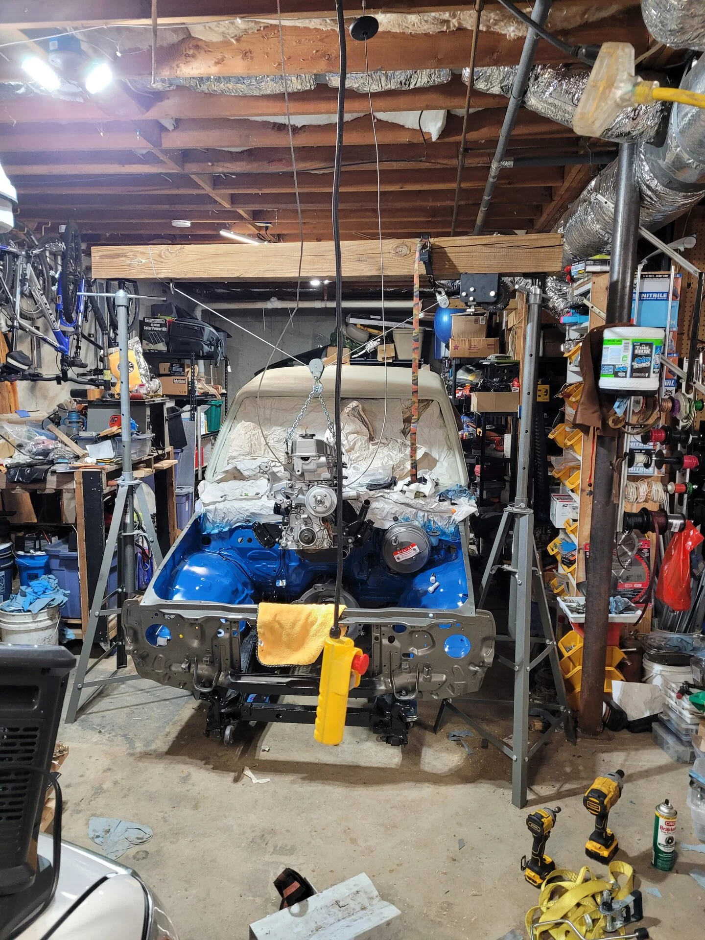 Made a little bit of progress. I was inspired by the early days of @Landbender before he had a lift and got the engine in and attached to the transmission. Had to clean up to cone on the shaft as it would not slide in to the pilot bearing. But smoothed it out and got everything to effortlessly slip in.