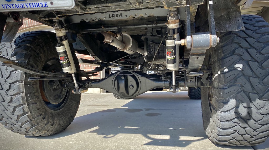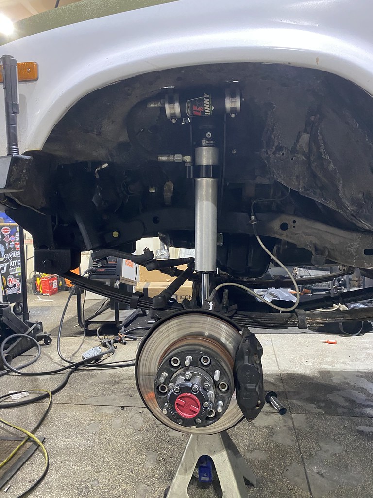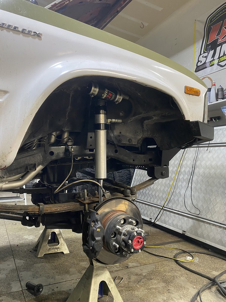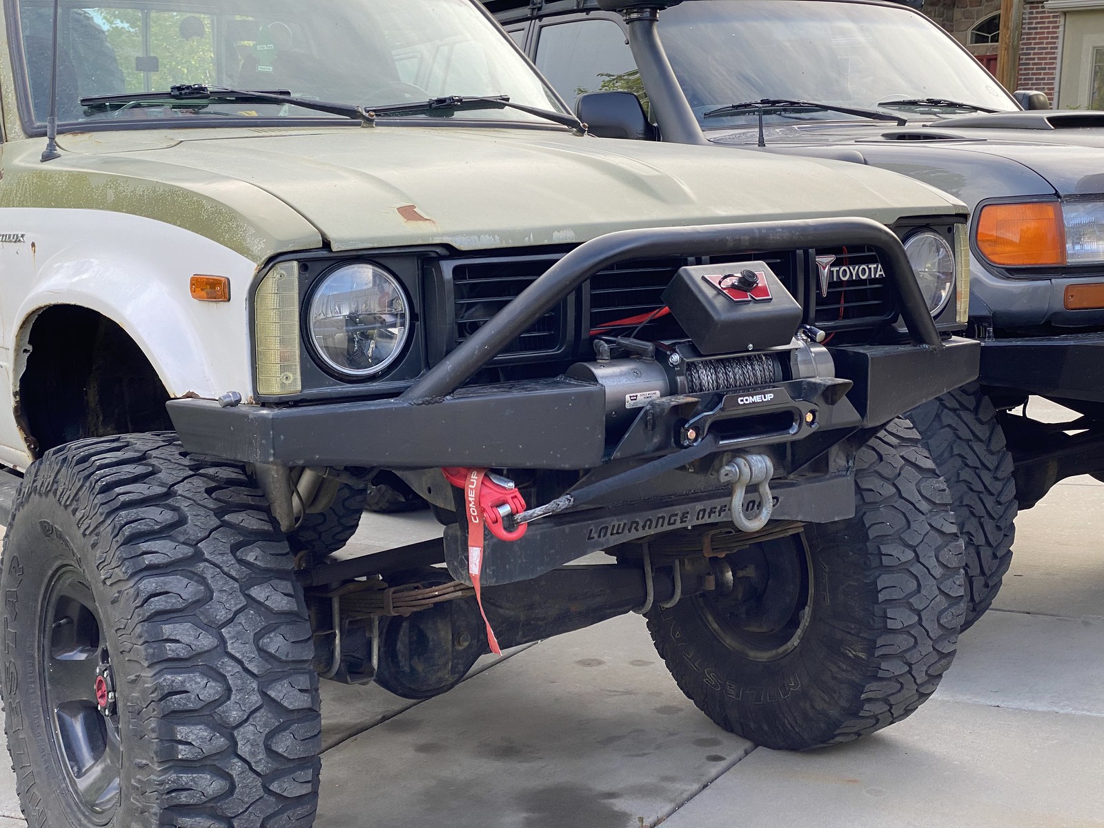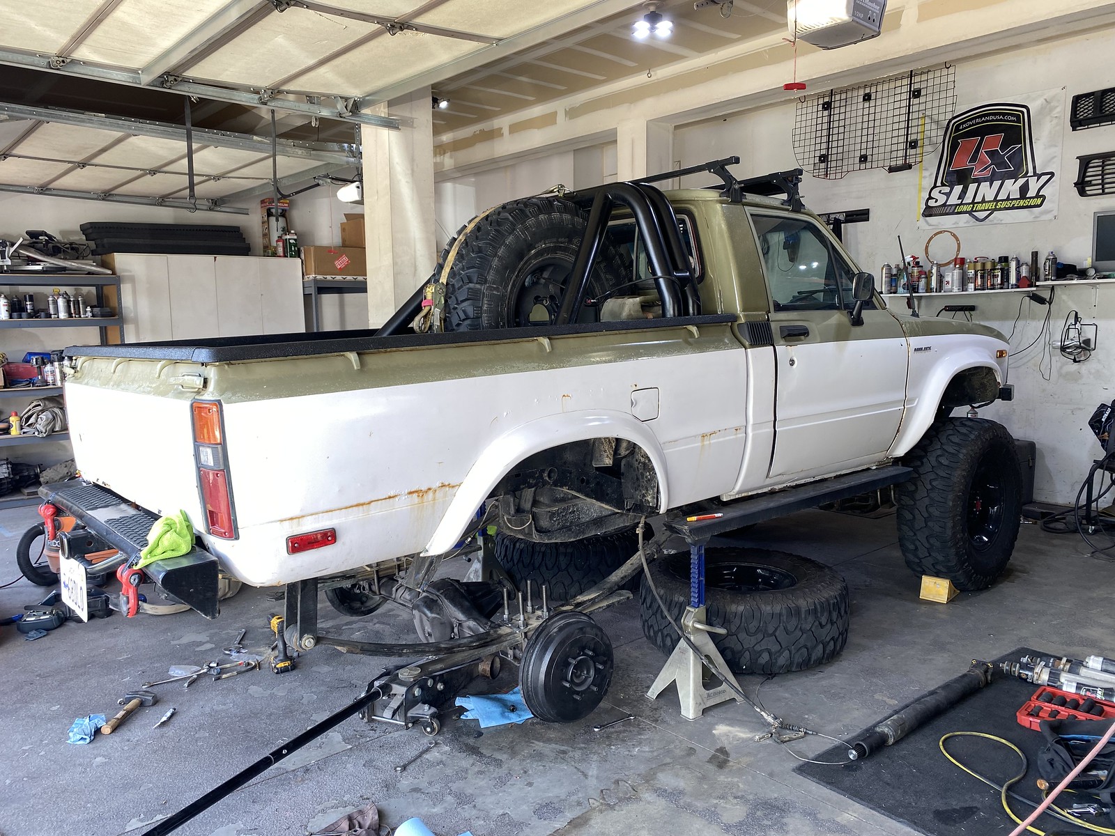 Lastly we addressed some of the suspension. The Doetsch Tech shocks were totally worn out and needed to be replaced. I had replaced the Slinky shocks in my 80 with some dual bypass shocks and had the 2.5 adjustable shocks that came off the cruiser so we decided to modify the shock mounts to accept the Slinky shocks. These are pretty firm since they are valved for the cruiser but setting them on the softest setting has been acceptable on the little truck. My son will have them rebuilt and valved properly as soon as he's saved up the money to rebuild them. But these are working soooo much better than the old DT shocks.