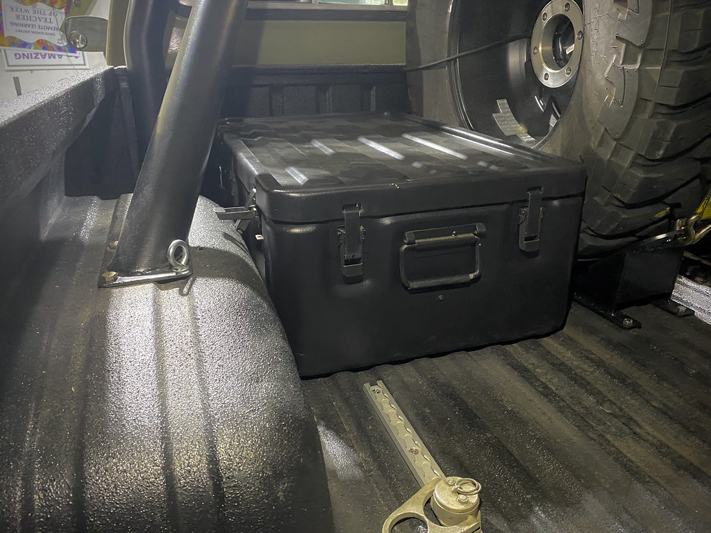 Mil-surplus medical supply box is being used for tools etc. This is bolted down and we added a way to lock it.