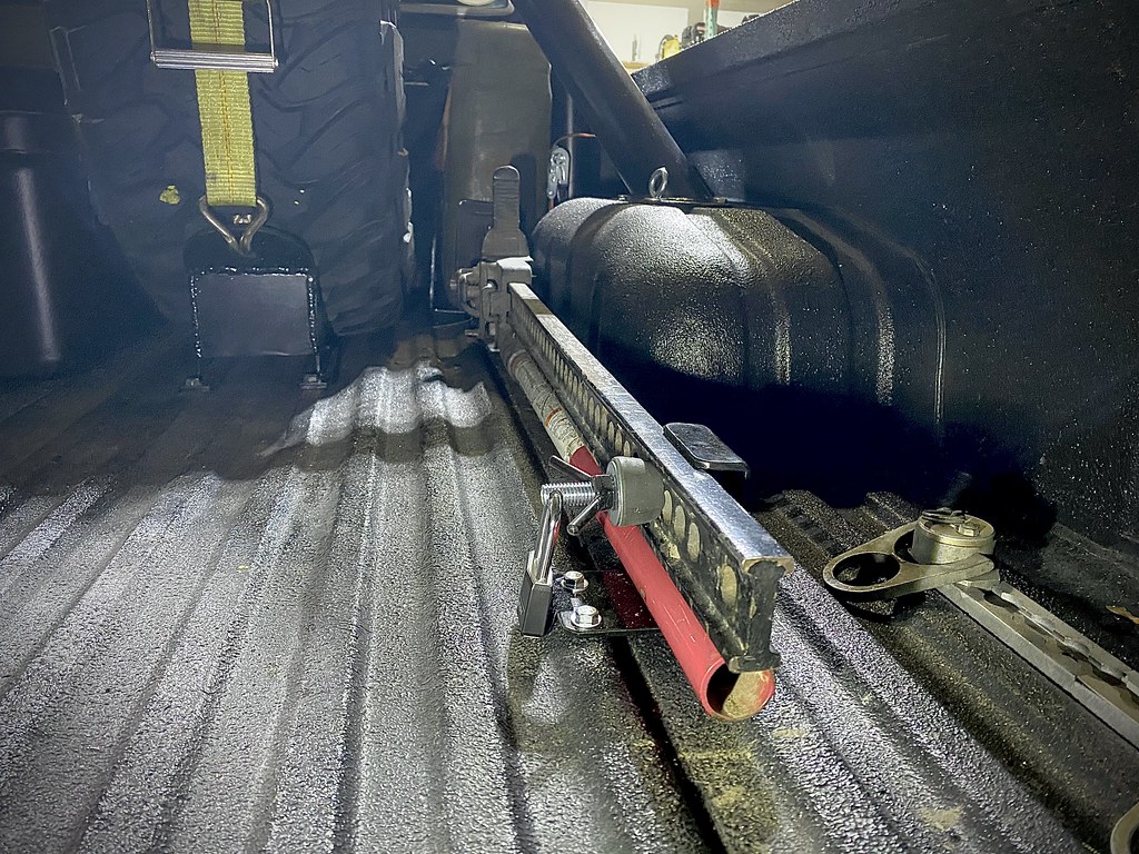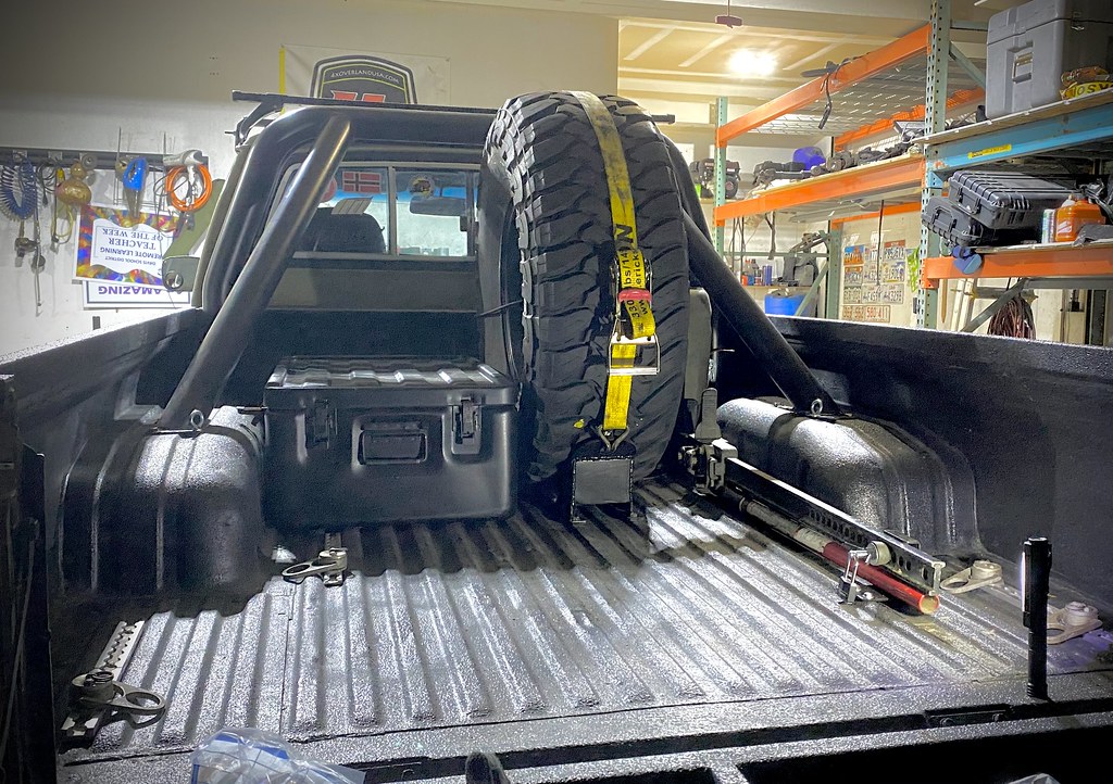 Spare tire mount. After having this in the truck for a while we've decided to move it to the driver side of the bed instead of the passenger side. It blocks visibility in it's current location and works much better behind the driver. Just waiting for my son to be home from college for the summer and we'll make some of these updates.