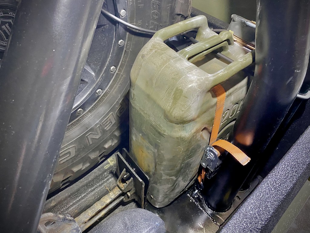 The forward bracket for the hilift included a "basket" for a fuel can. There's a cable lock through the fuel can handle and spare tire to keep them from walking away.