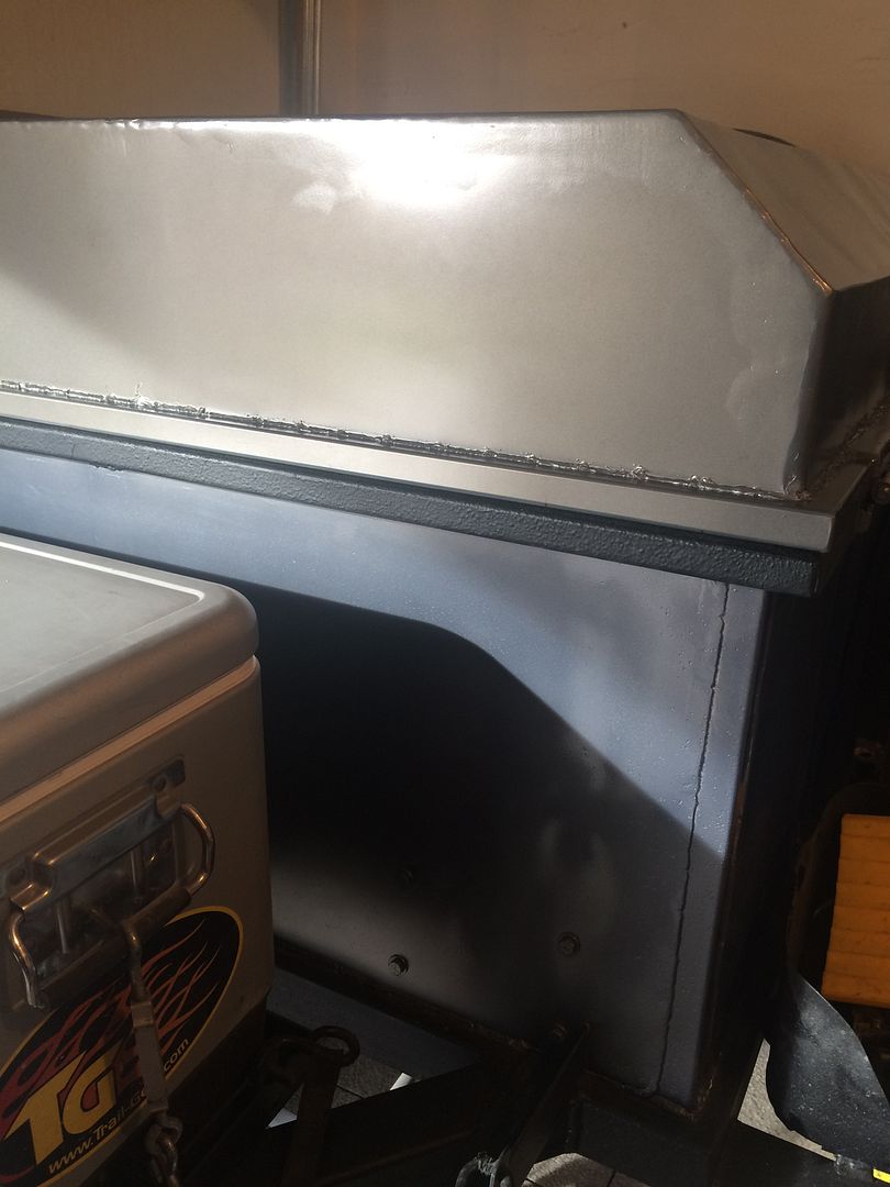 It's mostly cut pieces. There is one sheet for the top surface, a piece for each end and the sides are each one bent piece. I don't have a press brake so I used the "whiskey bend" method but cutting about halfway through the sheet with a cutoff wheel along the line of the bend, then bent it and rewelded the surface.Did someone bend that lid for you or did you weld pieces together? I dig it!!!