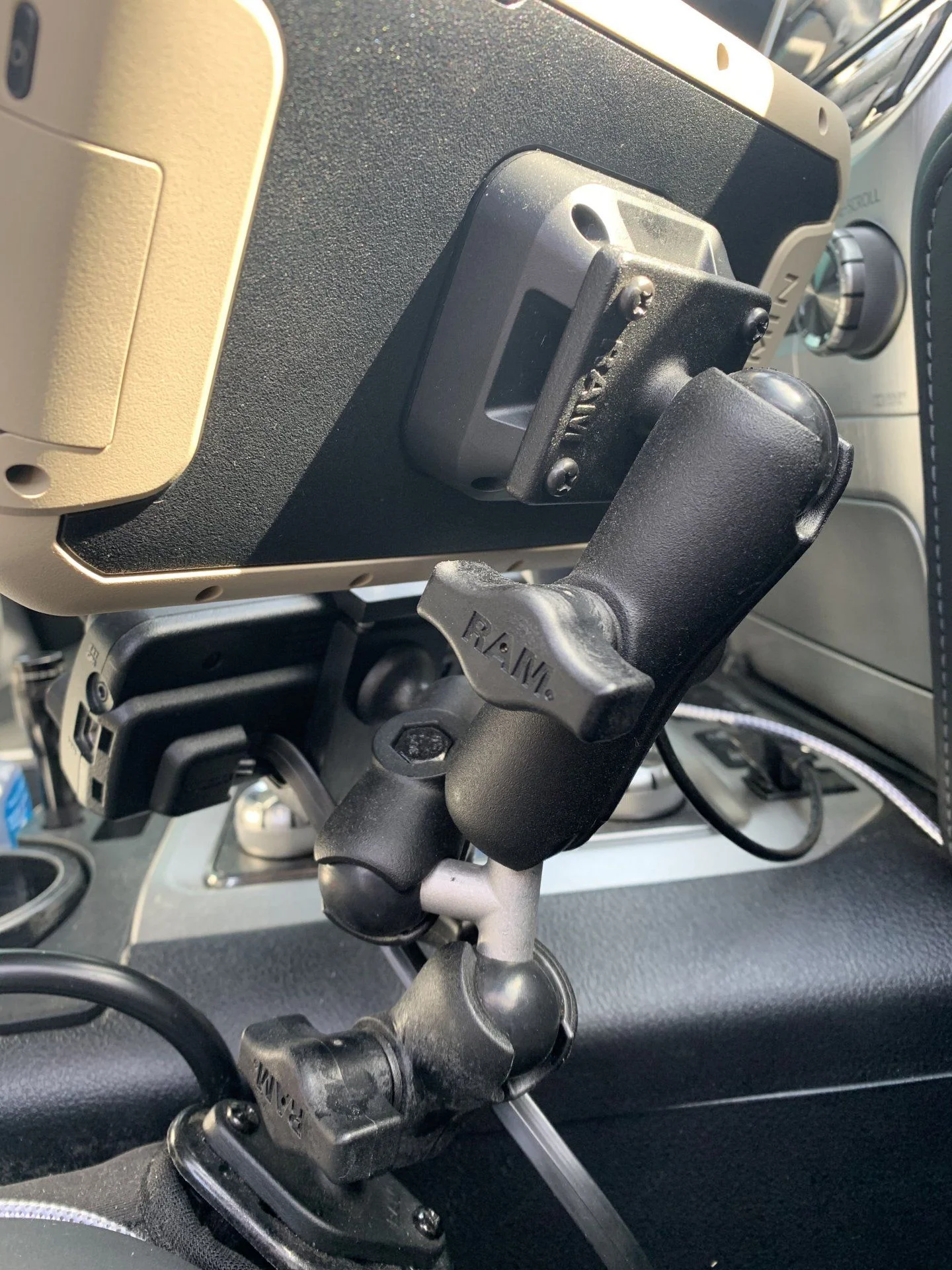 I will take a picture and post it in a little bit. I used a Ram wedge between the seat and console.Could you please post a pic on how you have the garmin and ham ram mounted?