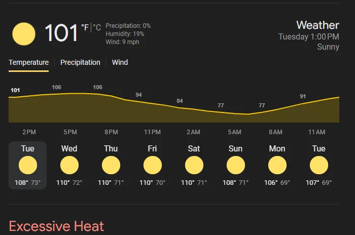 Yeah, a bit rough! It's typical to get 100-105 for a handful of days in a row, and multiple times over the summer.. but multiple days of 110+ is ehhhh