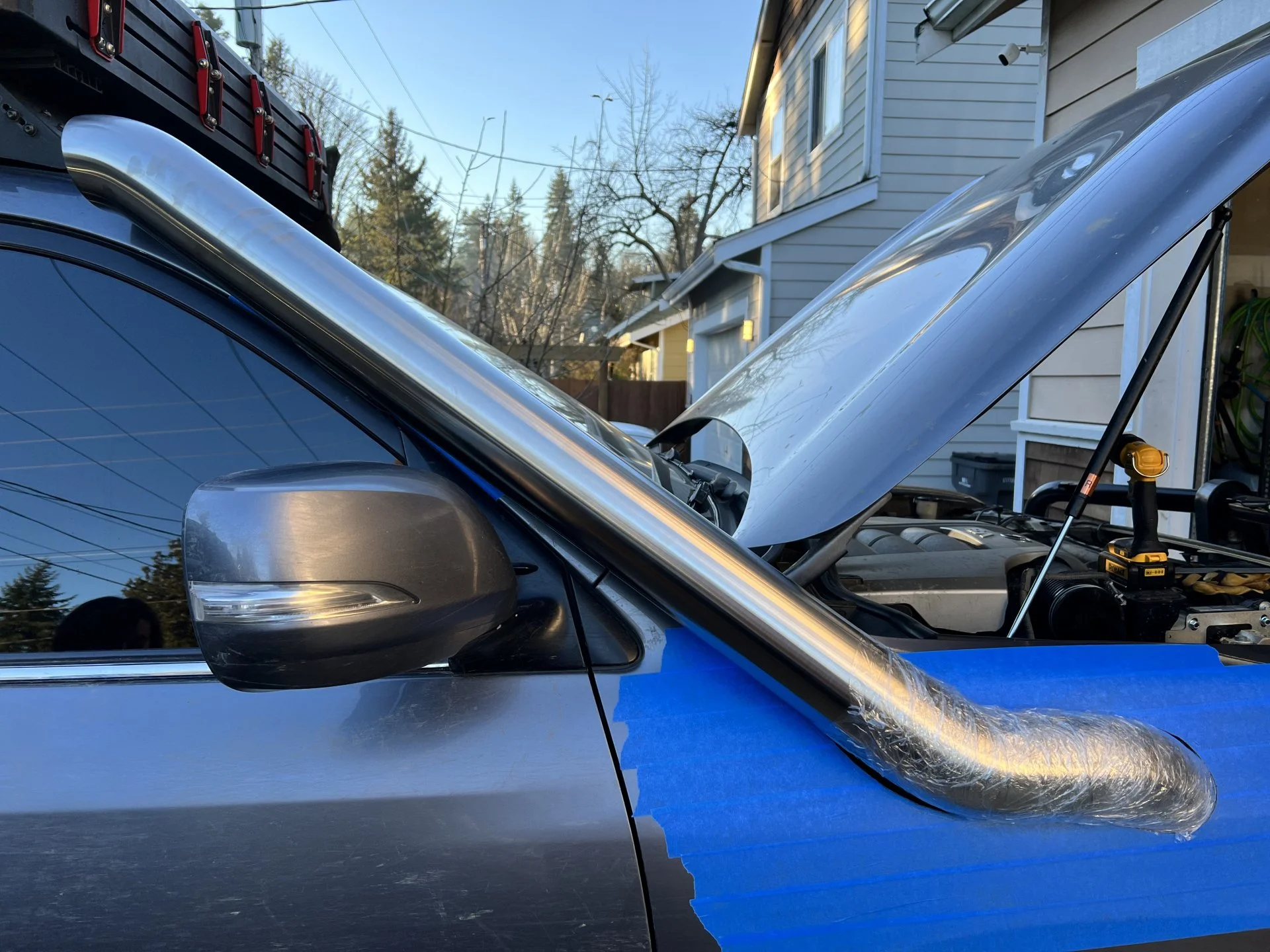 One thing I’ll mention for everyone doing the install, I suggest taking the lower portion of the airbox out and installing the 90 on the end then reinstalling the lower airbox with it attached. Little difficult to get it on there. Trying to do it on the truck would be near impossible is my guess. Added to that the provided hose clamp is definitely intended for the Australian airbox and not ours. It was a two person job to hold the hose clamp tight enough to start to thread it again. Yes I could get a larger one, this one does work though. I bent it to the curvature of the airbox inlet and it sealed it up tight.