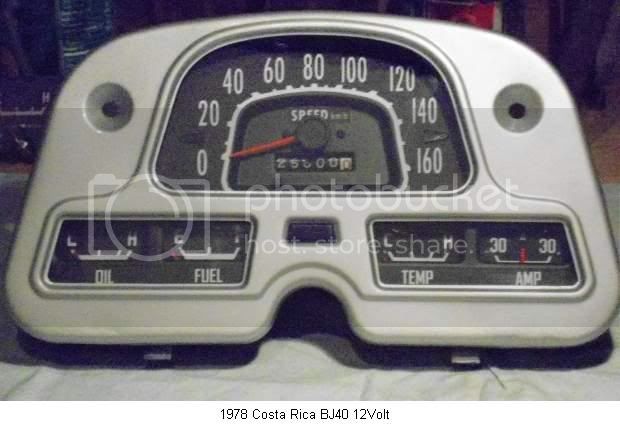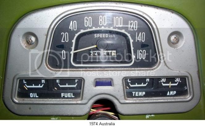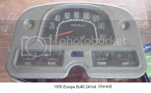 In Feb. ’74 the BJ40 24V edition came into the European and Canadian market. This is not visible when you look at the front of the cluster but will show when you turn the cluster around and look at the back. There is a “dropper” resistor to bring the 24V down to 12V for the FUEL and TEMP gauges. The OIL gauge is different and is clearly marked 24V (after removing the front) in the right bottom of the gauge and has a different sender of course. The AMP gauge is the same for 12V or 24V clusters. More about this in a later posting.