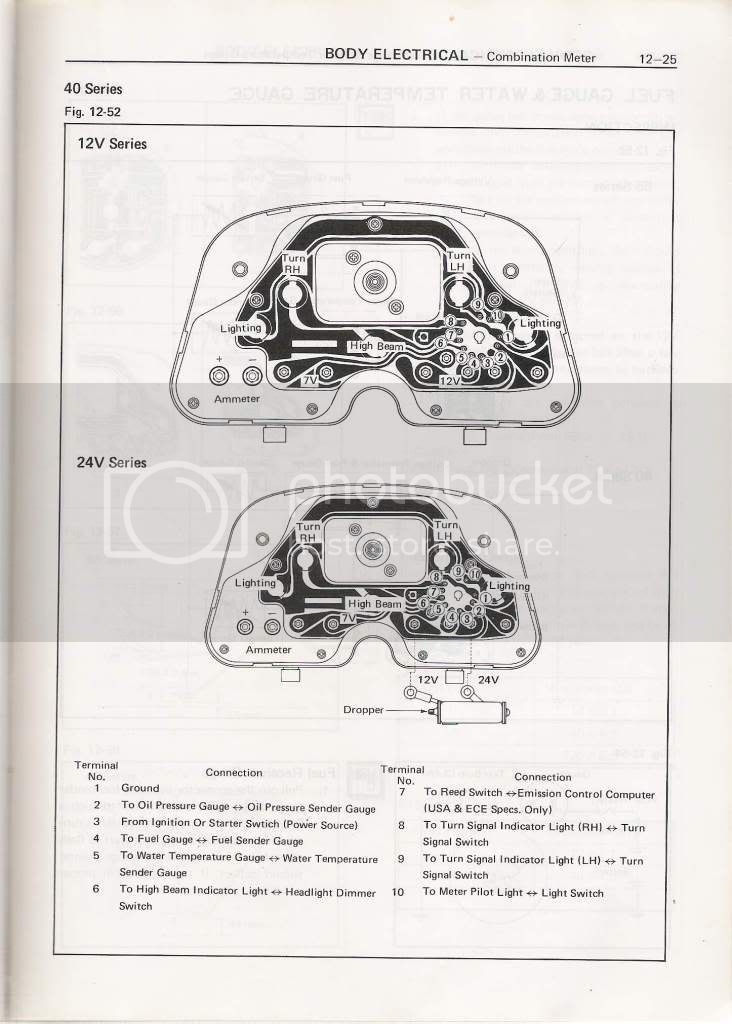 I am looking for the complete FSM of electrical body (the one you used to explain how to fix the cluster gauges) I cant find it anywere and need info about the hazard switch, back up switch, etc… and maybe you have or know where this can be found. My TLC its a BJ40 ´75 with 24V electrical system.