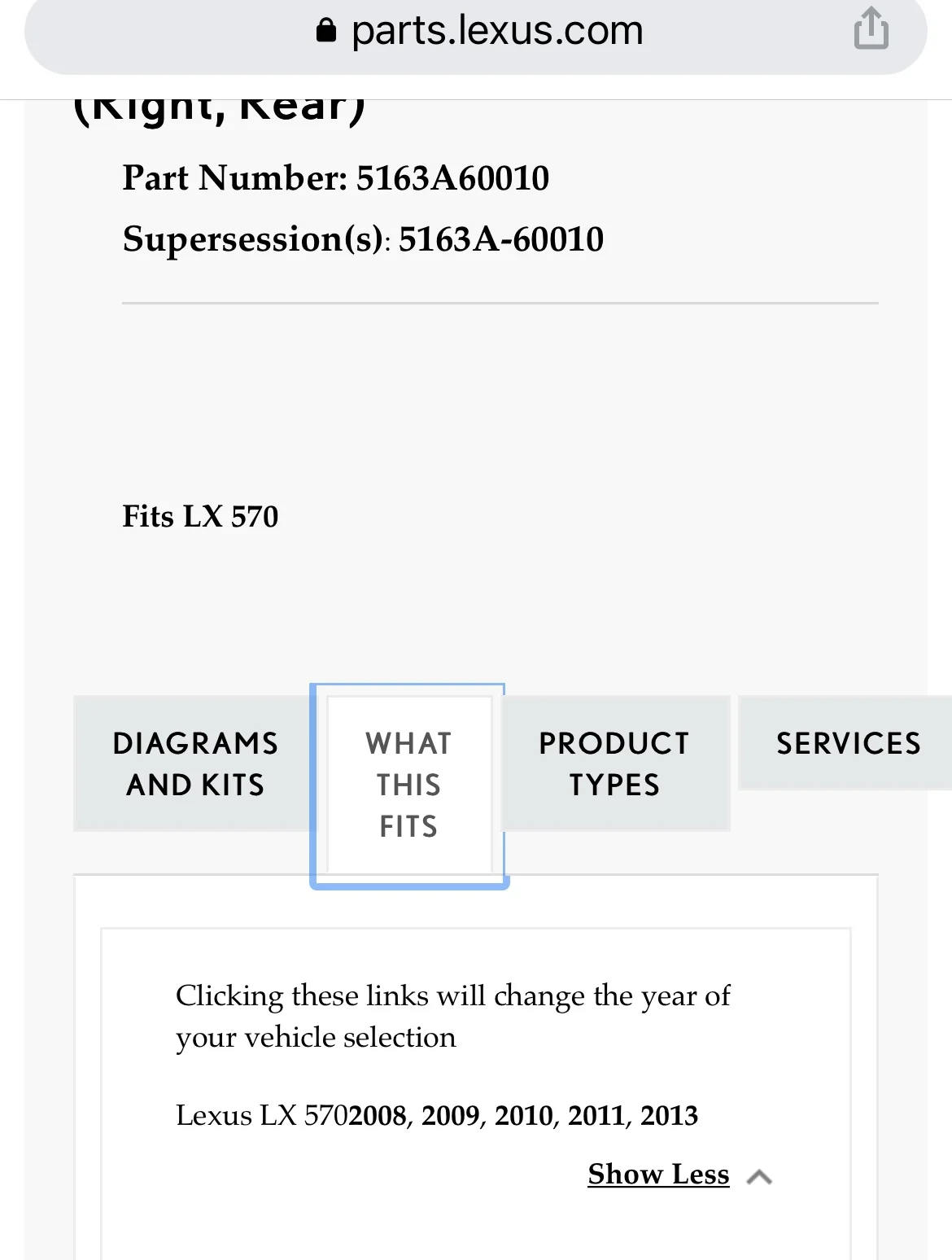 That is super weirdThe Toyota parts sites show that part number as only limited fitment (2008-2011). Lexus shows 2008-2013.