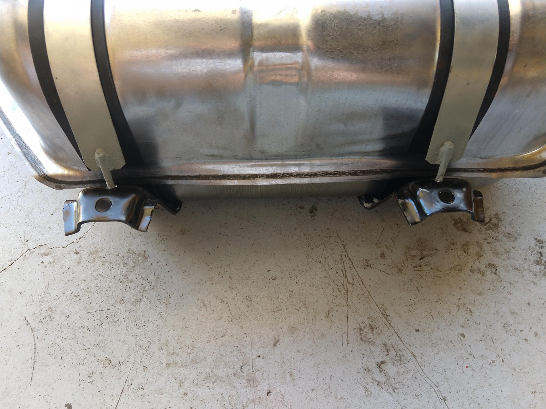 Here's how I did the straps--just welded a 1/4" bolt onto the end of the 16ga strip, drilled holes in the ends of the GM brackets, and bolted down with the rubber strips between all the metal-to-metal areas. I also dented the corner of the tank slightly, to leave more room for the Toyota filler tube. That may or may not be necessary, but it made me feel better.