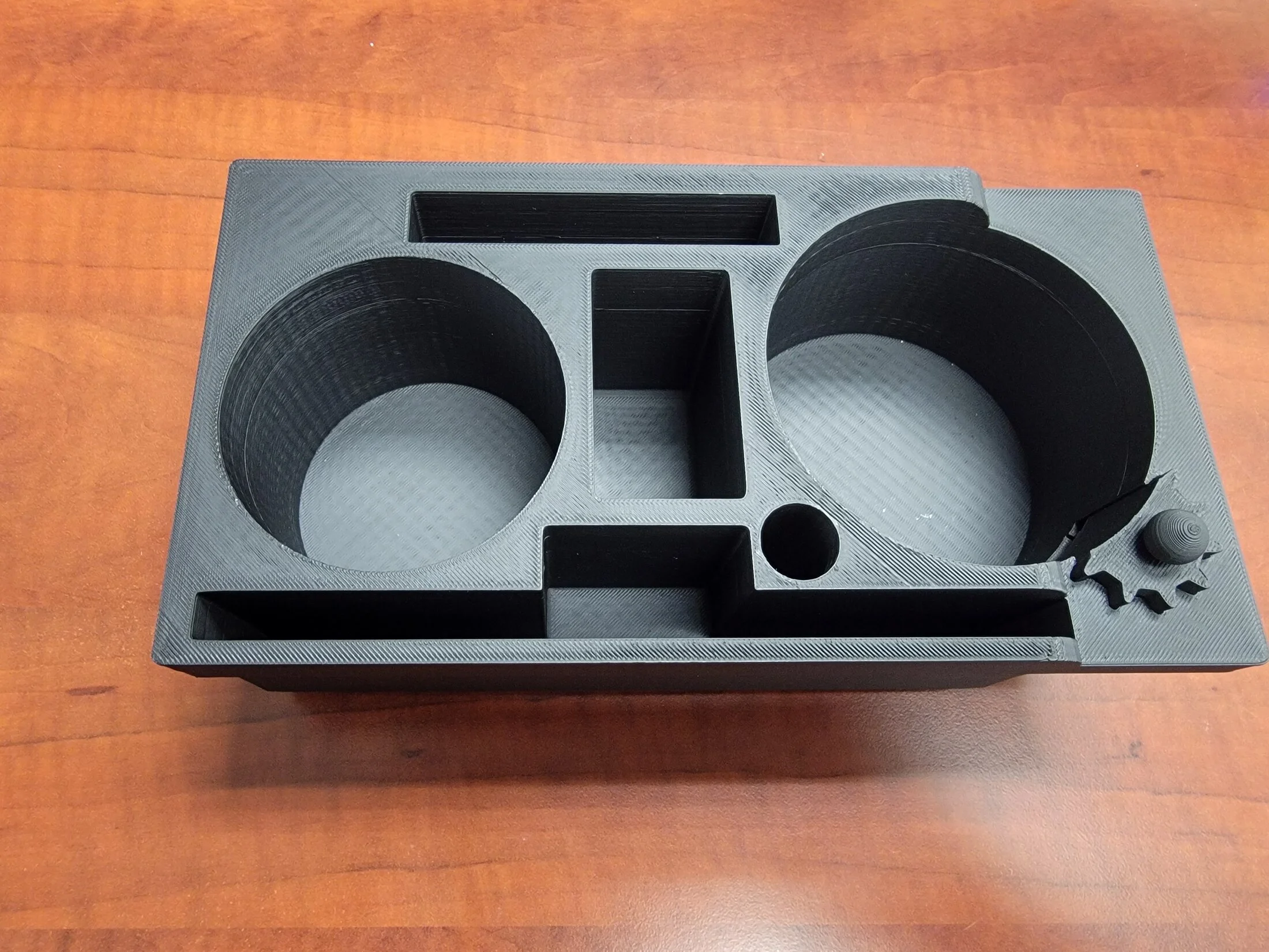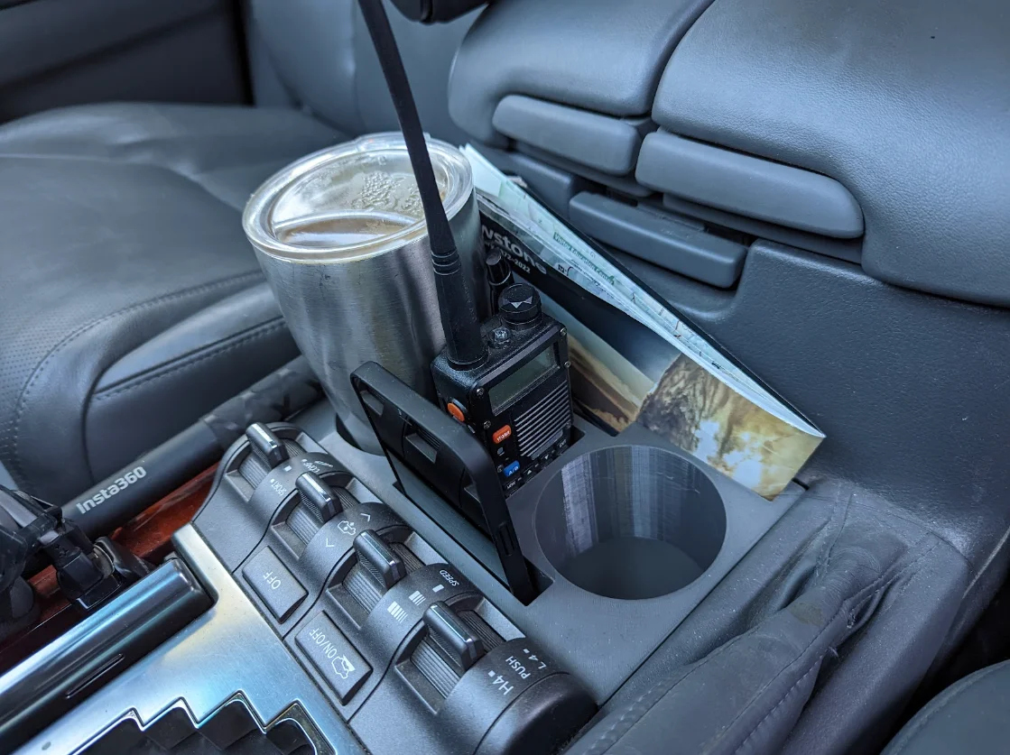 Cup holder for a Toyota Land Cruiser 200 with different diameters and rings to fit different sizes of bottles, cans and cups.There are different versions:LC200_CH_2D_LTwo Diameters (2D) with 81mm and 72.85mm to fit a standard Euro bottle and the common regular 20Oz Yeti mug/rumbler with a cutout...