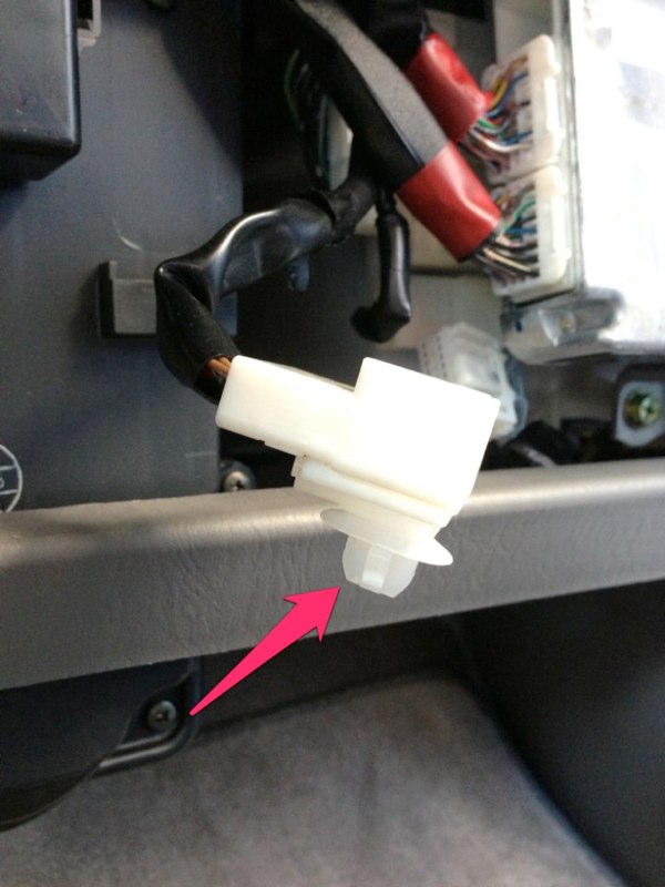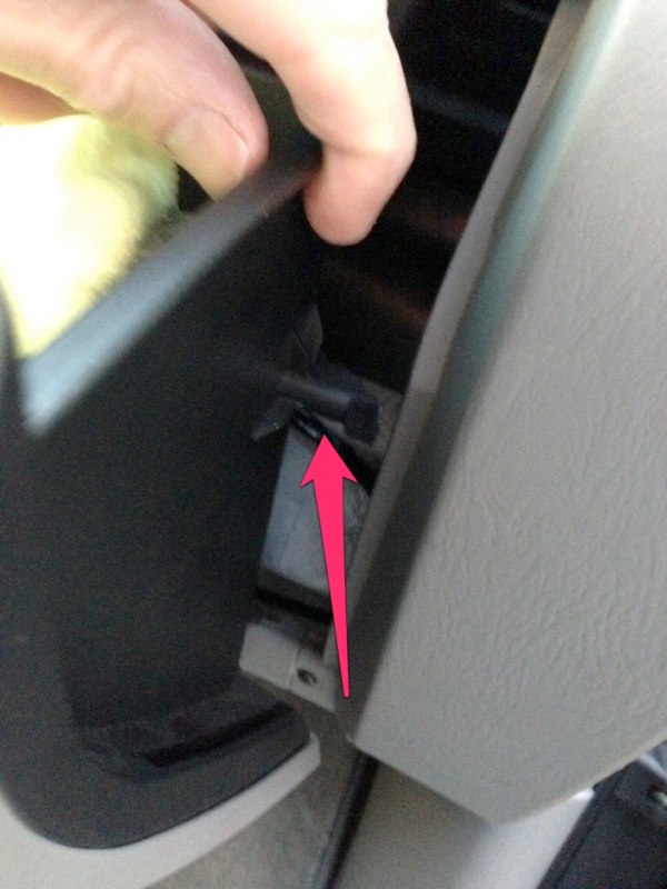 Next I had to disconnect the lanyard that attaches to the left side of the glove box. This tends to retract up into the dash and may be hard to find once you need to re-assemble. Now the glove box is free to place out of the way.