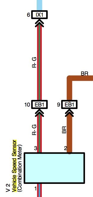 Next was locating the appropriate wires to attach the speedo box to the stock wiring harness. The wiring diagram shows the Vehicle Speed Sensor (VSS) passing through connector IX1 before heading to the speedometer. It’s shown as PIN 6 on IX1 and is R-G (Red w/ Green). This is the wire to tap into with the Blue and Brown wires from Marks Speedo Box. From the 2004 EWD...